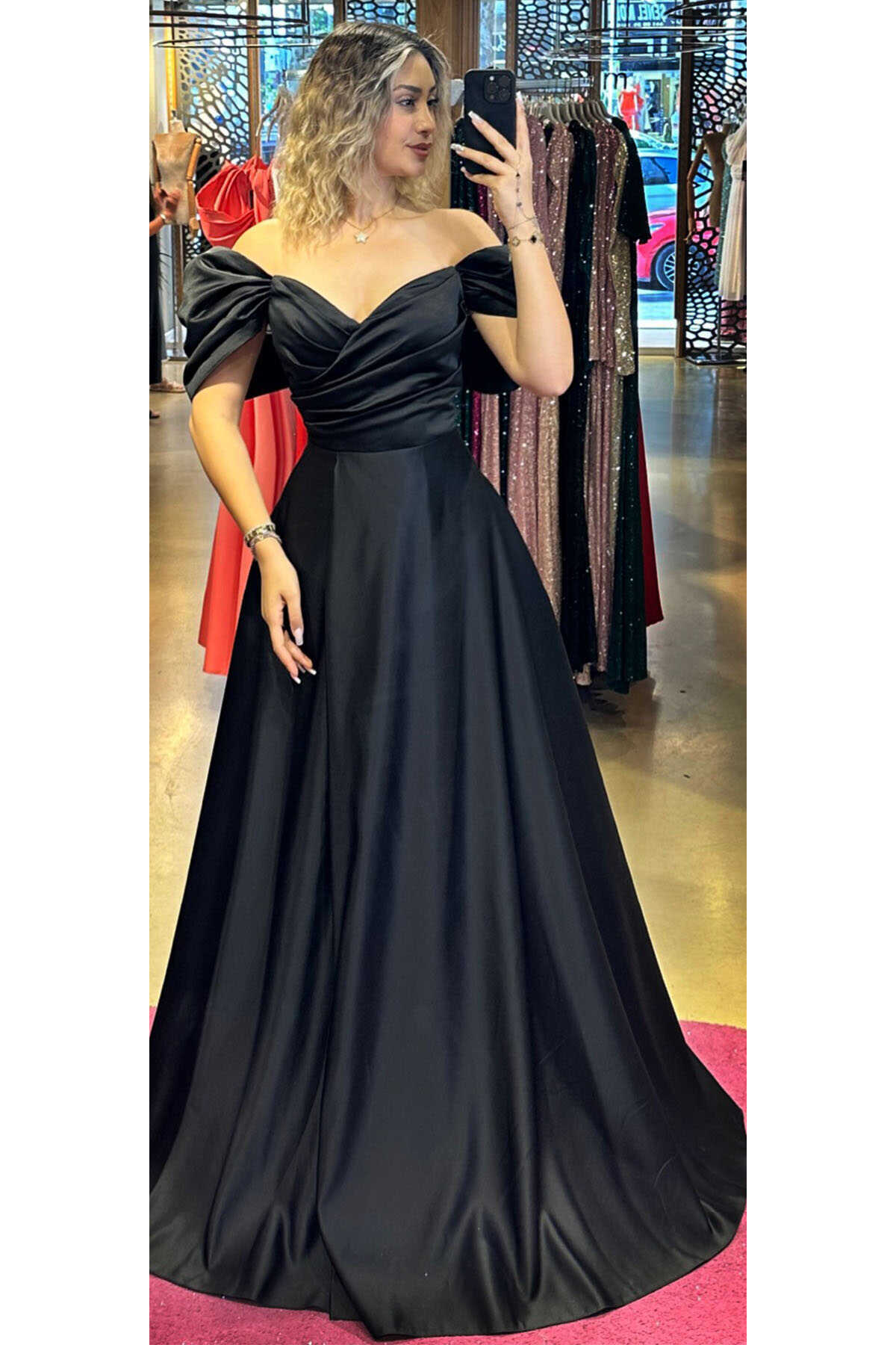 Lacivert Renk Kloş Etekli Uzun Abiye Elbise, Saten Kumaştan Üretilmiş Olup Satenin Pürüzsüz Işığı Görünümünüze Zarafet Katacaktır.