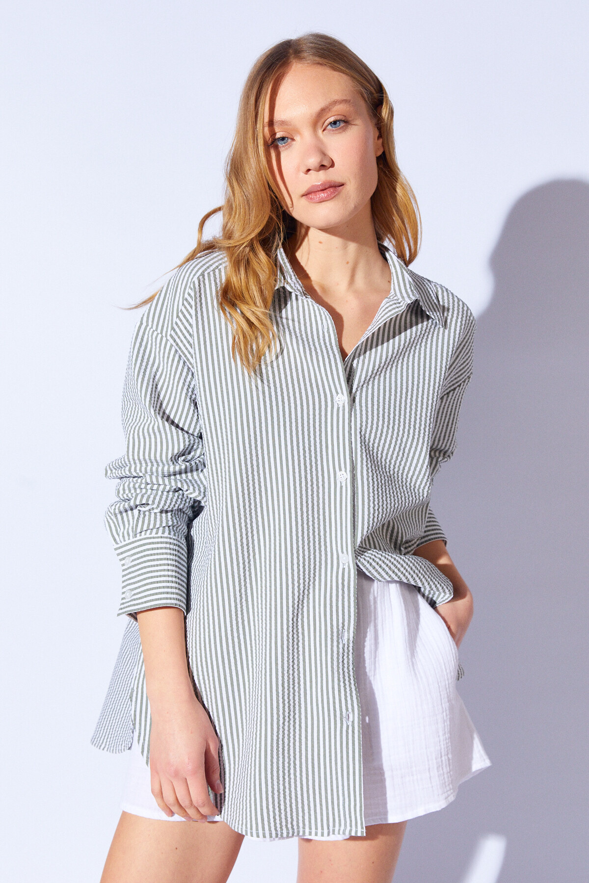 Gofre Çizgili Oversize Rahat Kesim Kadın Gömlek - Göz alıcı saks rengi ile dikkat çeken, lacivert tonlarına sahip bir tasarım.