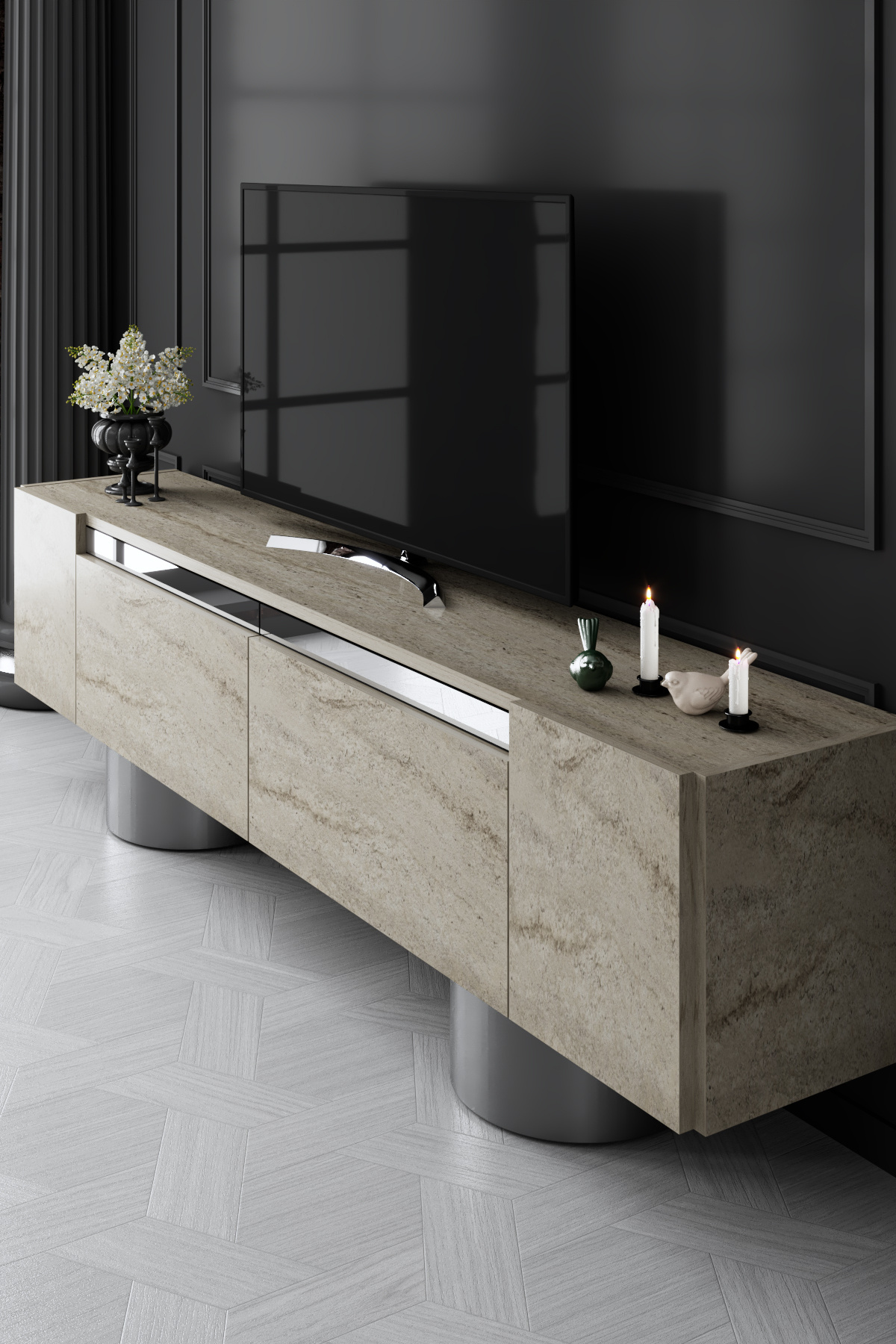BOHEM GÜMÜŞ METAL AYAKLI KROM TASARIM TRAVERTEN MERMER TV SEHPASI