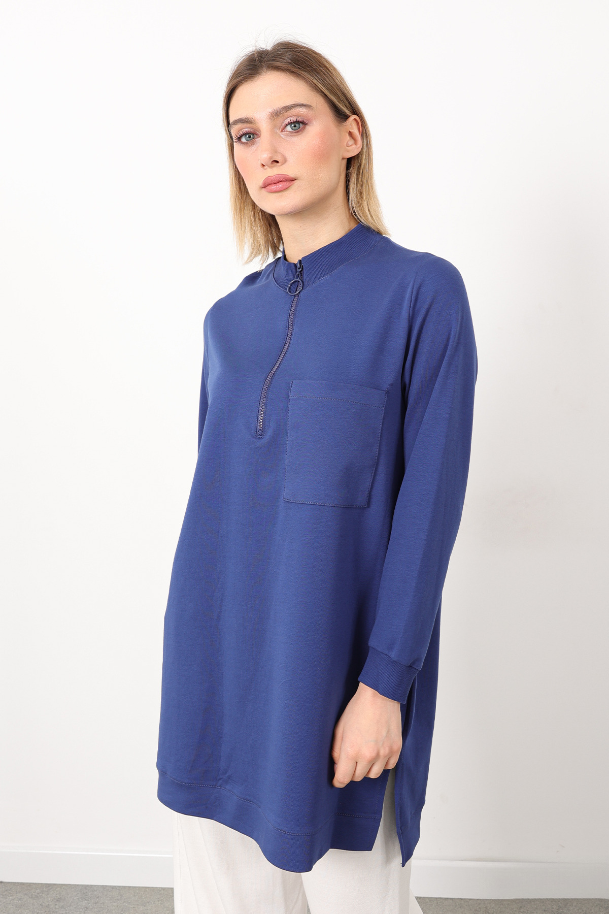 Günlük Dik Yaka Fermuarlı Tek Cepli İki İplik Rahat Kalıp Tunik Tesettür