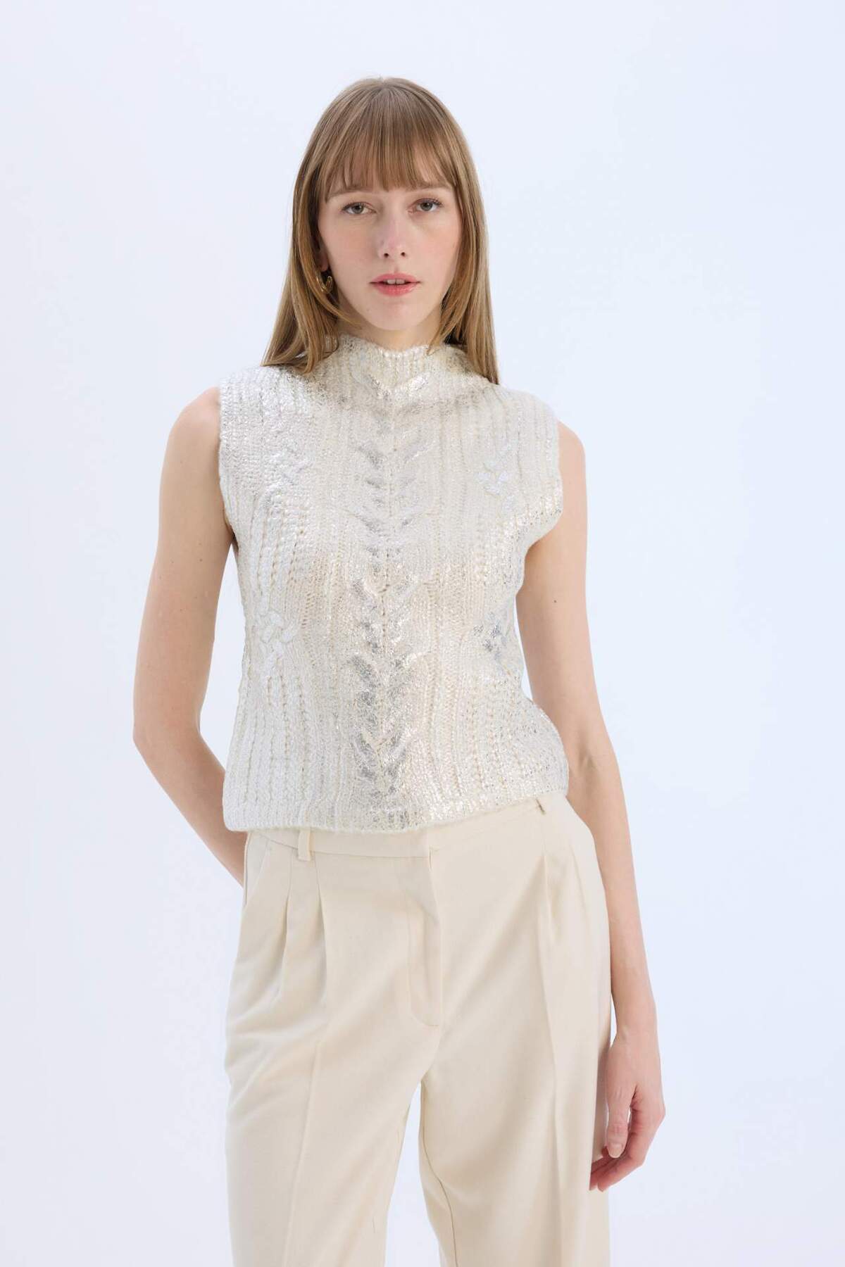 Parlak desenli ekru yelek, regular fit kalıbı ile özel günlerde şıklığınızı tamamlar.