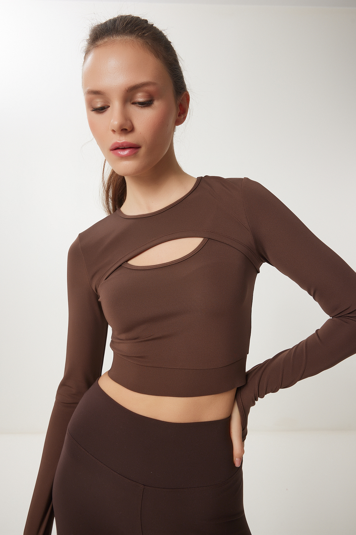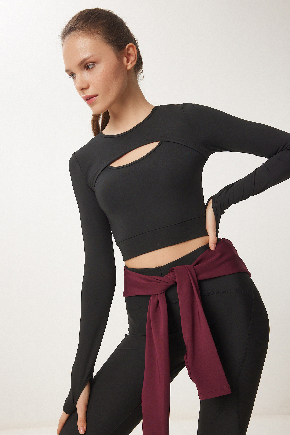 Parmak geçmeli, cut out detaylı, likralı, vücuda oturan örme spor bluz
