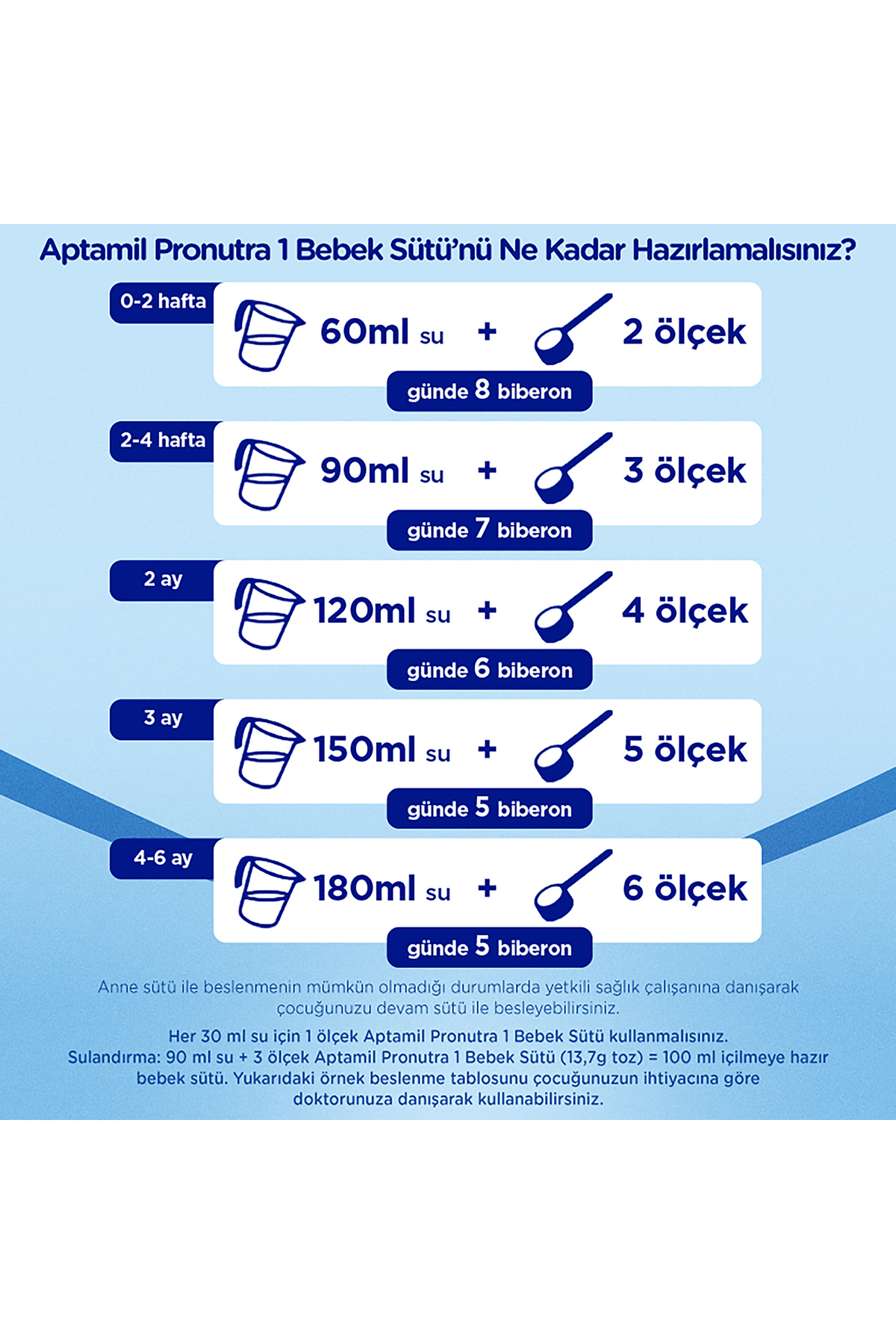 Aptamil Bebek Sütü’nü hazırlarken, her 30 ml su için 1 ölçek Aptamil Bebek Sütü kullanmalısınız. Aşağıdaki örnek beslenme tablosunu bebeğinizin ihtiyacına uygun sıklıkta doktorunuza danışarak kullanabilirsiniz.