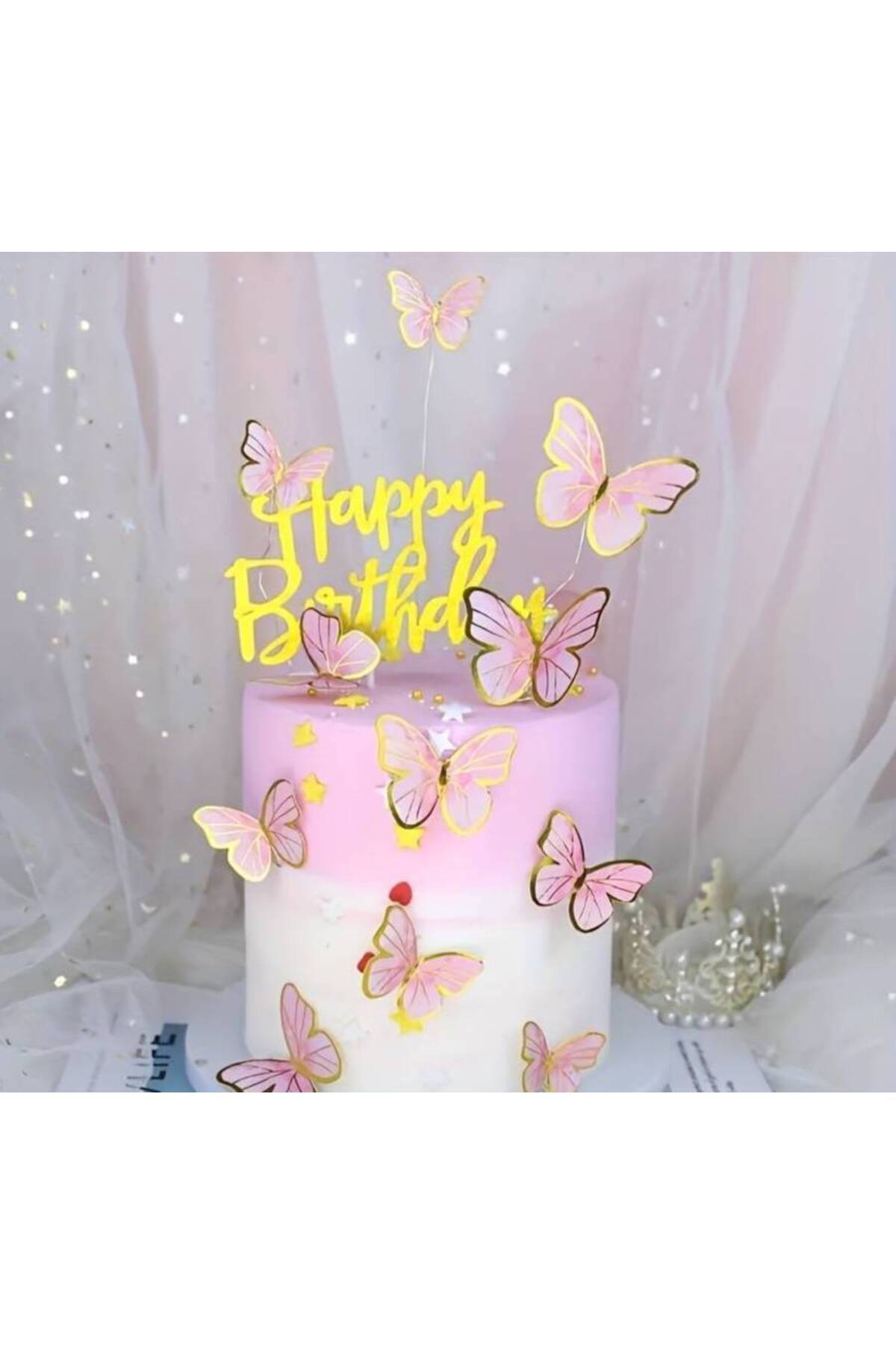 Kelebek Dekor Pasta Süsü Pembe 3 BOYUTLU Çubuklu Varaklı 11 Adet