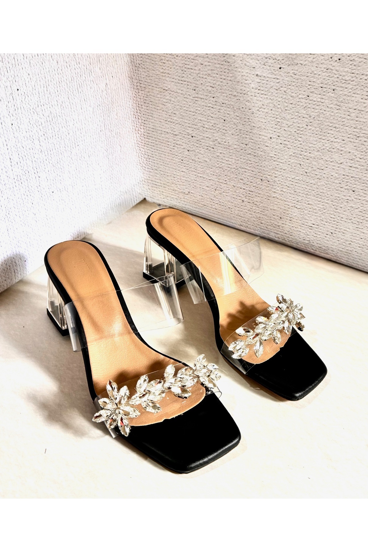 İnce topuk tasarımı ile zarif bir duruş sunan üç sıra taşlı şeffaf topuklu abiye ayakkabı, özel günlerinizde göz alıcı bir stil oluşturmanızı sağlar