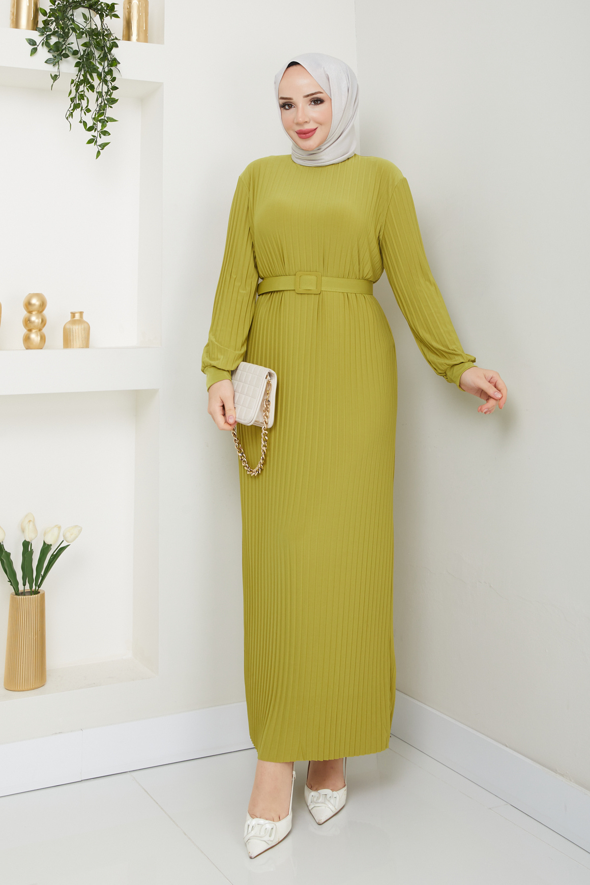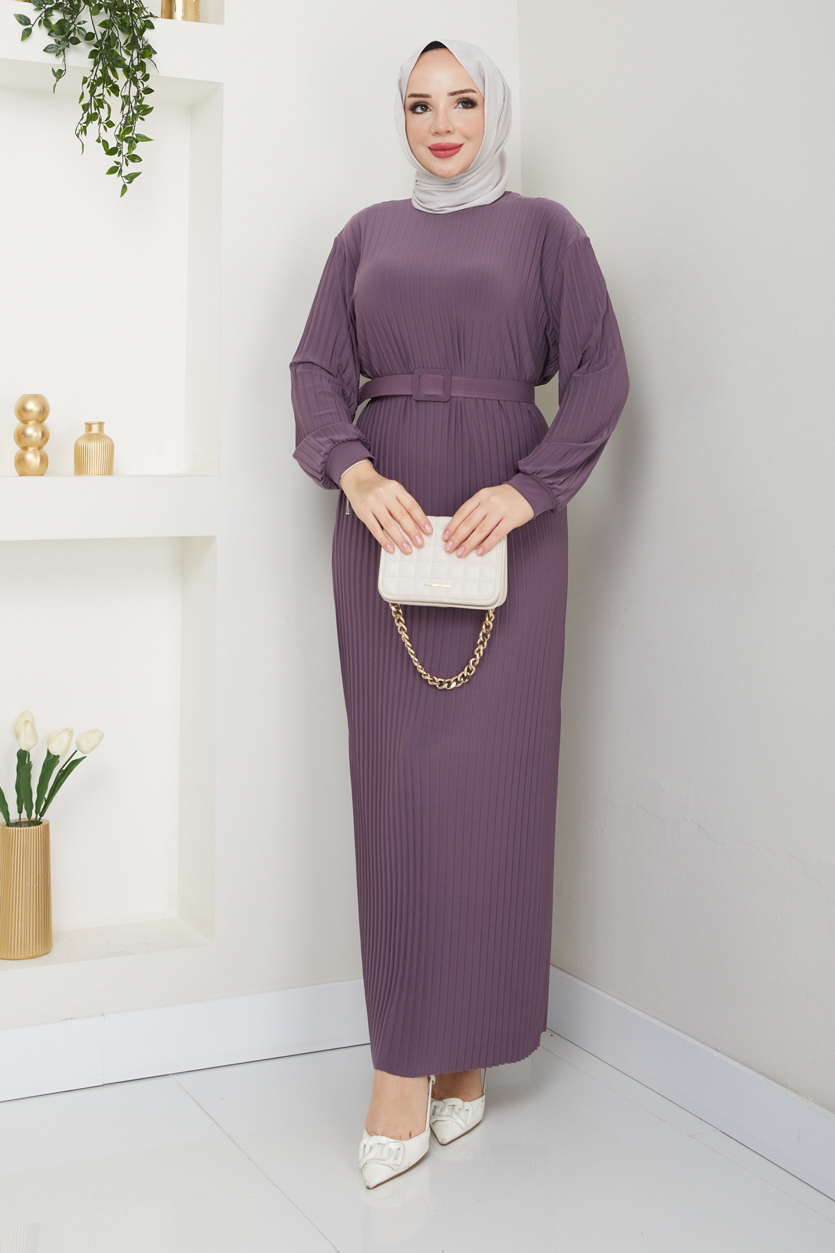 - Mevsim geçişlerinde şıklığınızı korumanız için ideal, kadife dokusuyla dikkat çeken boydan piliseli elbise.