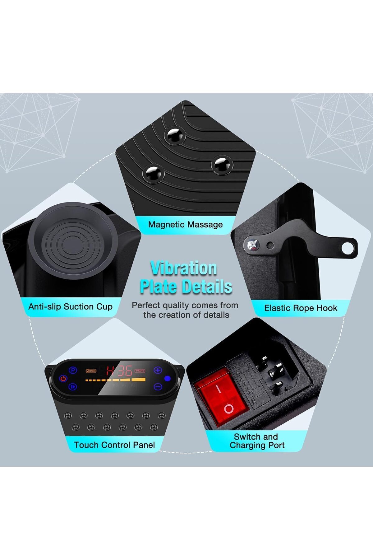 Teknik Özellikler Ürün Adı: Titreşim Plakası Nominal Voltaj:110V Nominal Frekans:60HZ Nominal Güç:200W Hız:1-120 * Verimli Yağ Yakma titreşim plakası, kalori ve yağları hızlı bir şekilde yakmaya ve fitness hedeflerinize ulaşmanıza yardımcı olan yüksek frekanslı titreşimler yoluyla kas kasılmasını ve aktivasyonunu uyarır.