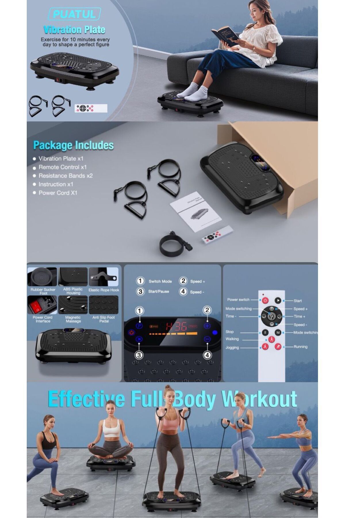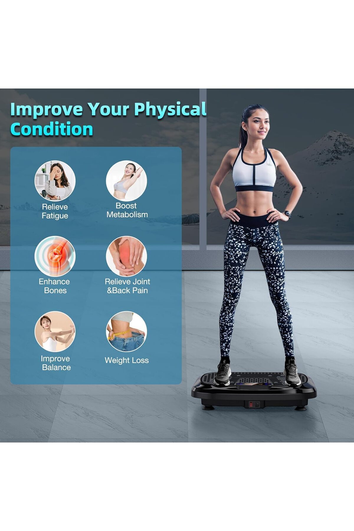 * Zengin fonksiyonlar titreşim plakası egzersiz makinesi, direnç bantları ve uzaktan kumanda ile donatılmış ayarlanabilir titreşim hızı da dahil olmak üzere beş modla çok yönlü bir egzersiz deneyimi sağlar ve günde sadece 10 dakikalık kullanım stresi hafifletmeye ve kemik mineral yoğunluğunu artırmaya yardımcı olabilir * Saklaması Kolay Titreşim plakası sadece 7 kg ağırlığındadır, daha fazla stabilite ve azaltılmış gürültü için dört adet kaymaz vantuza sahiptir ve 120 kg kadar kullanıcı ağırlığını destekleyebilir.
