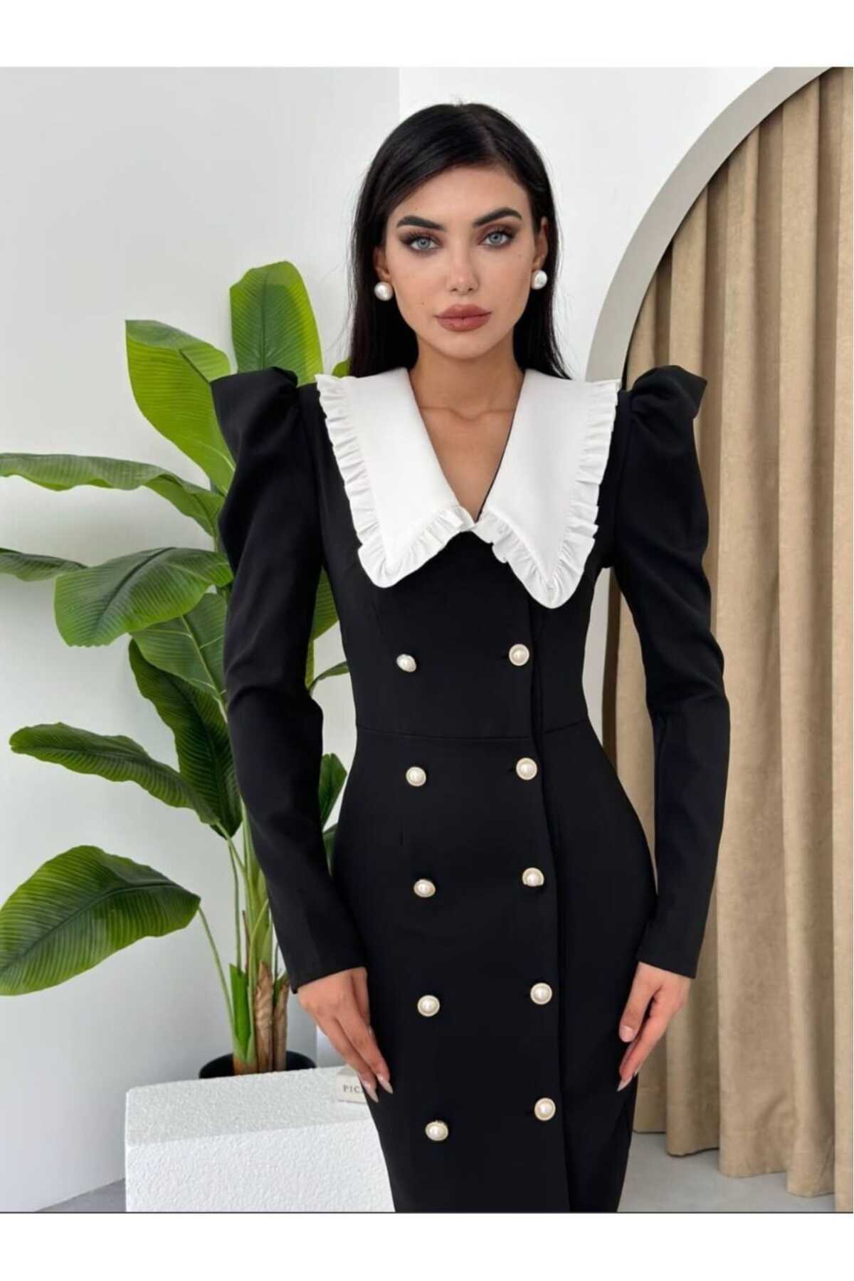 Siyah Bebe Yaka Puantiyeli Düğme Detaylı Premium Uzun Elbise