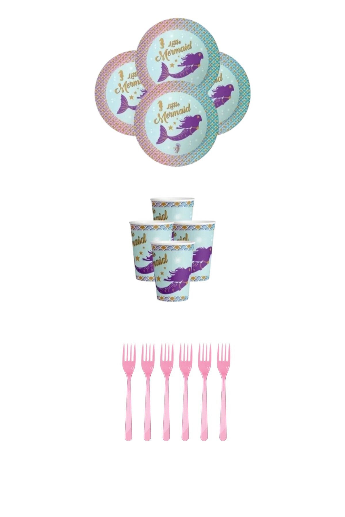 - Deniz kızı temalı tabak, bardak ve çatal seti ile doğum günü partinizde şıklığı ve eğlenceyi bir arada yaşayın.