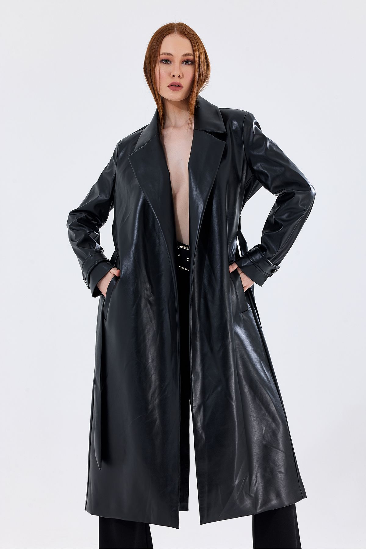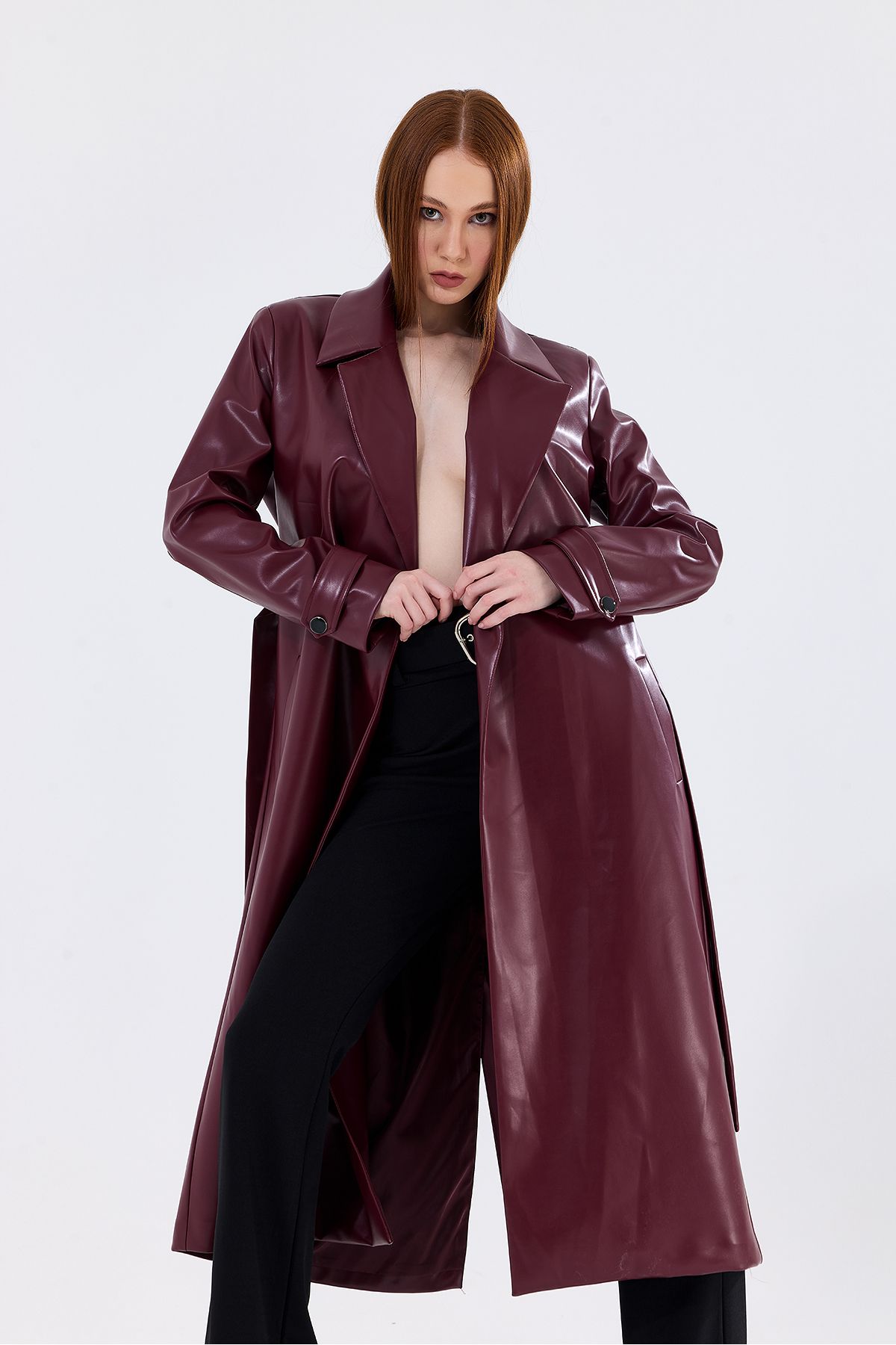 Astarlı Beli Kuşaklı Apoletli Suni Deri Trençkot Pardüsü ÇİKOLATA