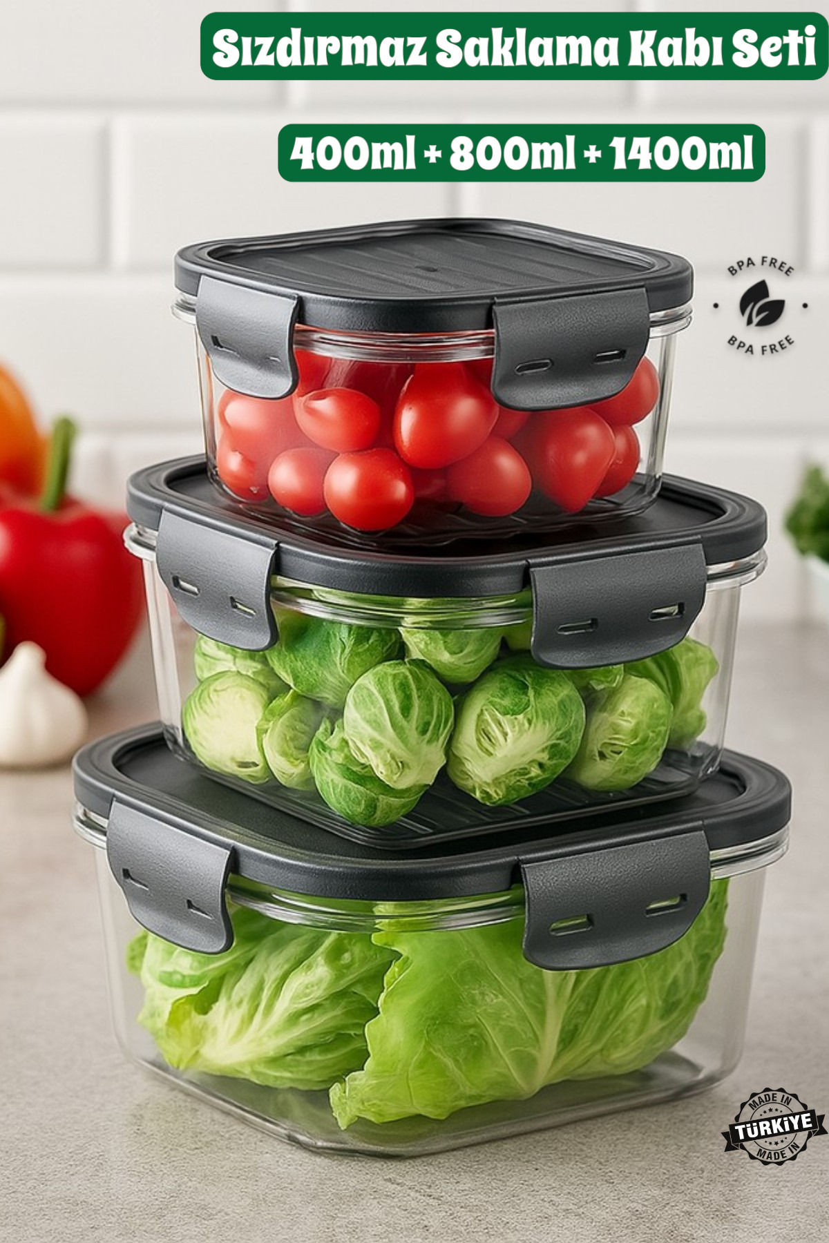 Tam Vakumlu Hava Geçirmez Sızdırmaz Kilitli Saklama Kabı 3'lü Set (1400ML 800ML 400ML)- Bpa Free