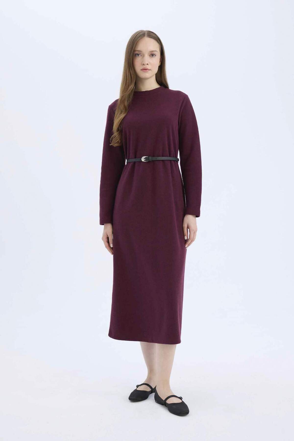 Regular fit bisiklet yaka midi elbise, selanik kumaşı ve kemerli tasarımıyla hem rahat hem şık bir görünüm sunar.