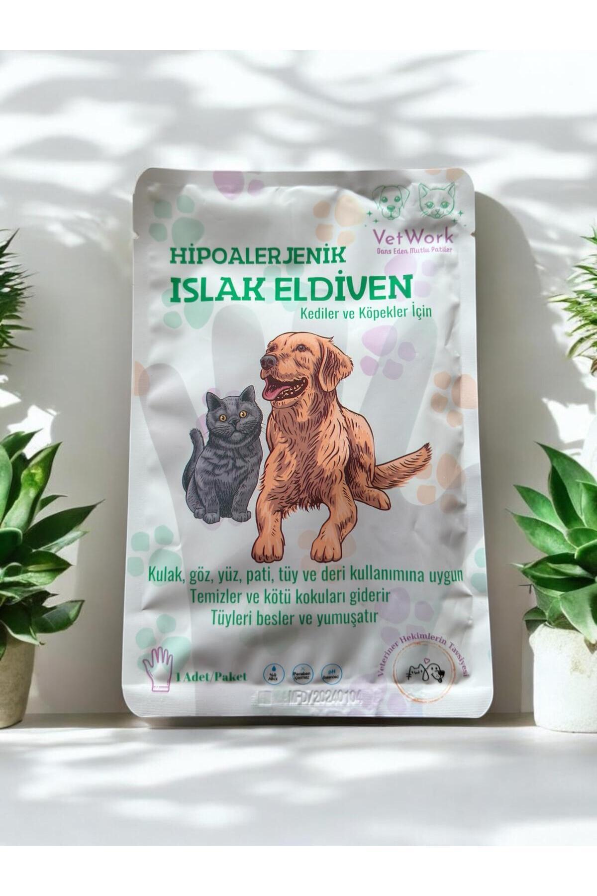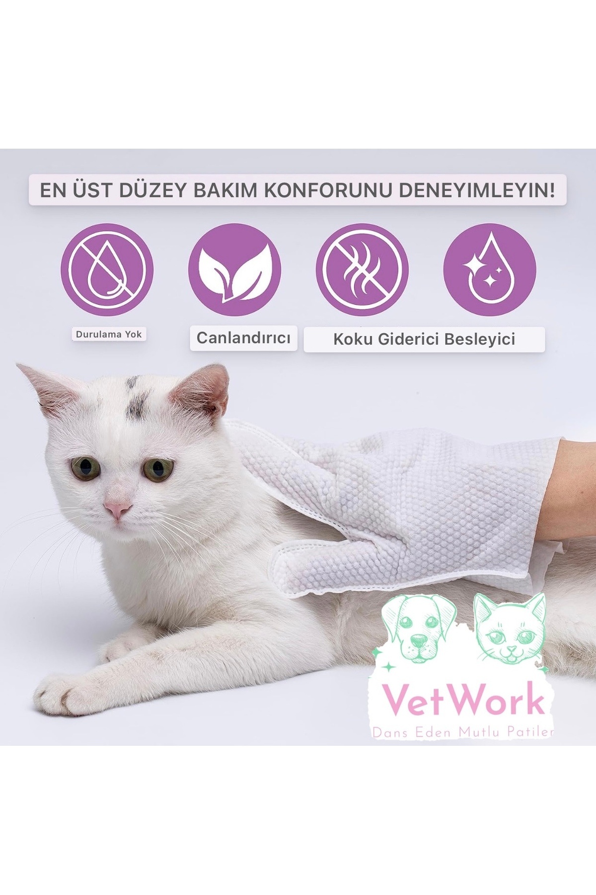 VetWork Islak Kedi Köpek Bakım Solüsyonlu Eldiven eşsiz gümüş iyonlu içeriği sayesinde evcil hayvanınızın kusursuz temizlenmesini sağlar.
