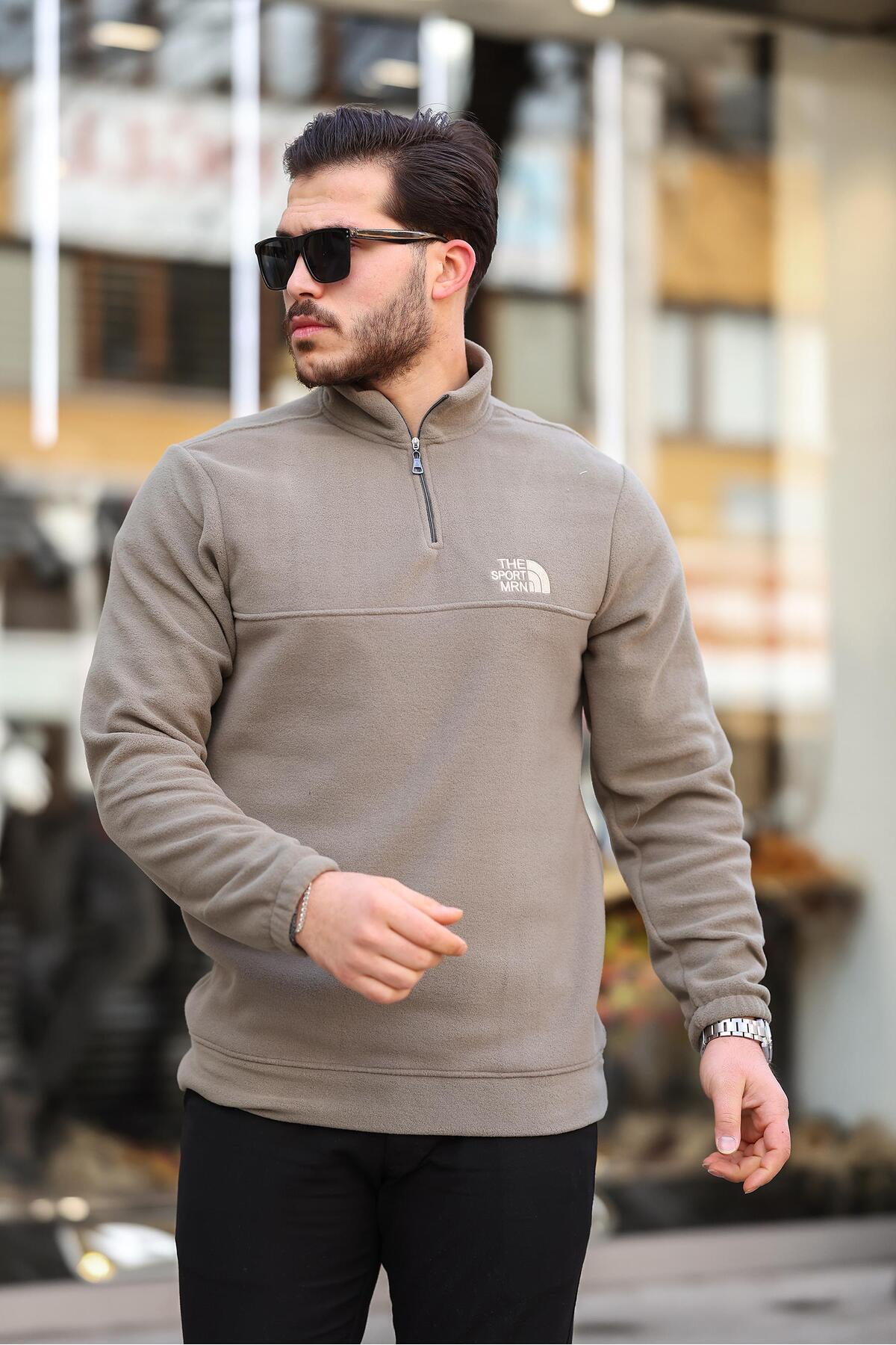 Kahverengi Unisex Nakışlı Dik Yaka Yarım Fermuarlı polar Sweatshirt- 2321