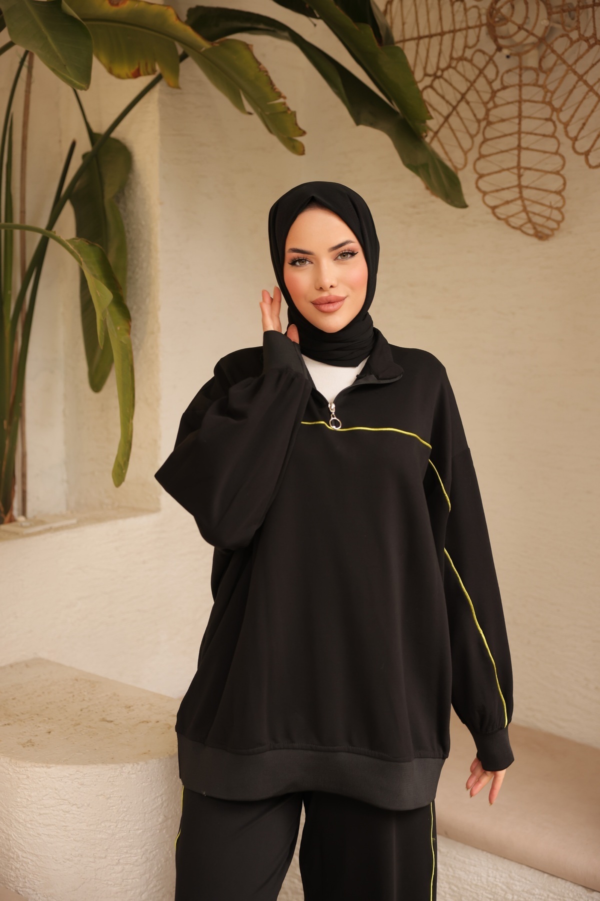 ayrıca fermuar detayı estetik bir dokunuş katmaktadır.