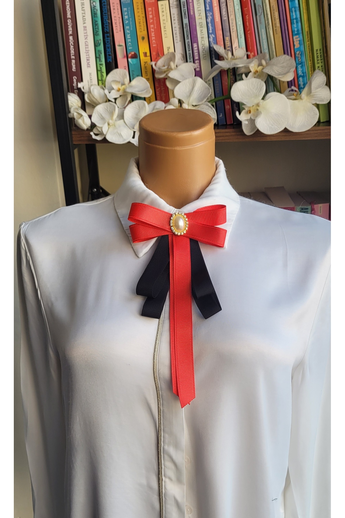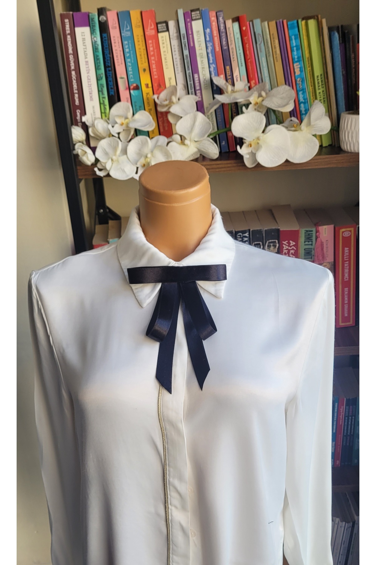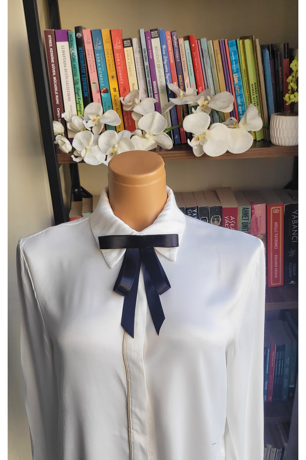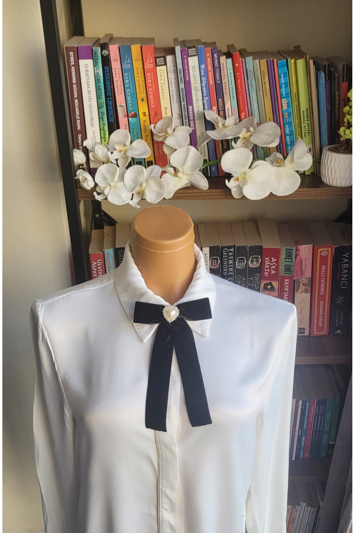 - Saten malzemesinin lüks dokusuyla göz alıcı bir görünüm kazandırırken, papyon yaka broş detayı modern bir stil oluşturmanızda yardımcı olur.