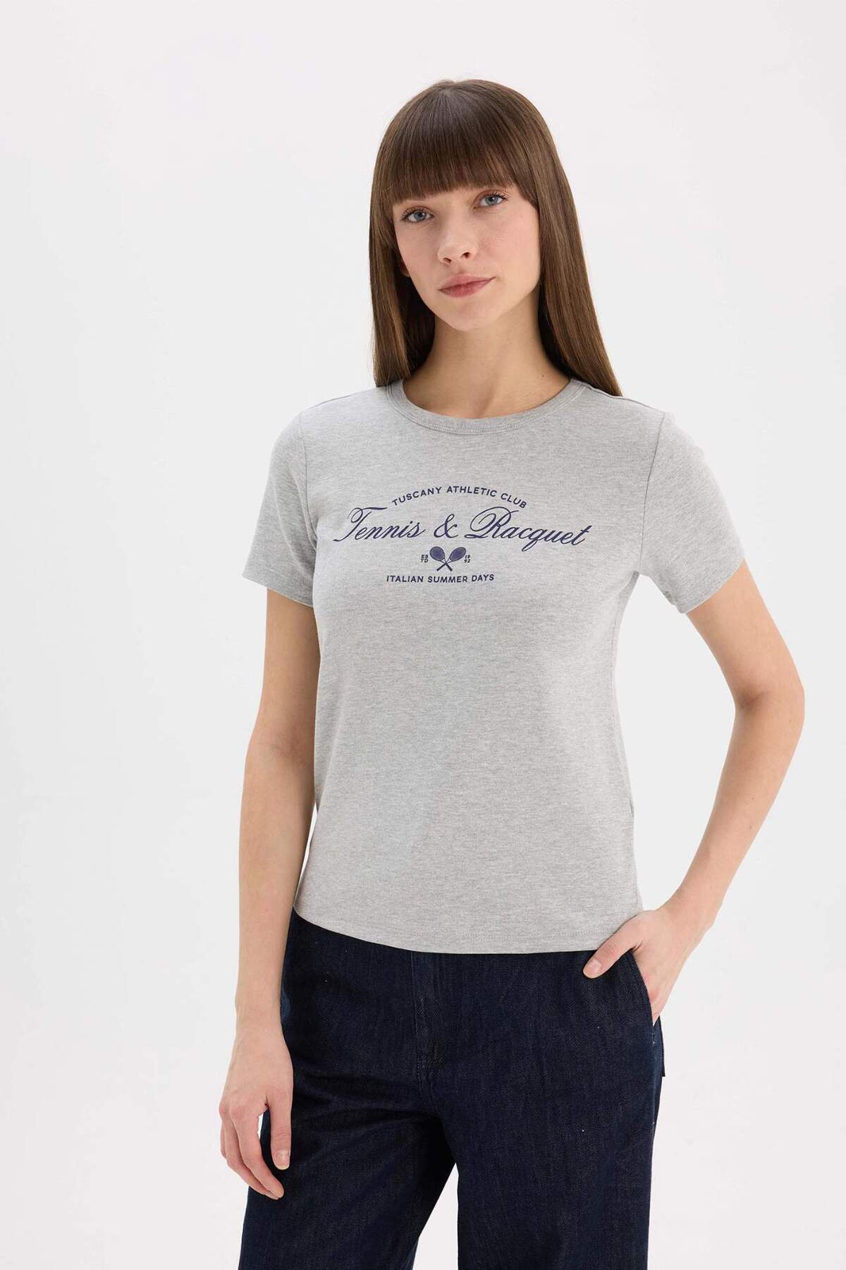 Yetişkin kadınlar için örme kumaştan üretilmiş gri slogan baskılı kısa kollu bisiklet yaka tişört.