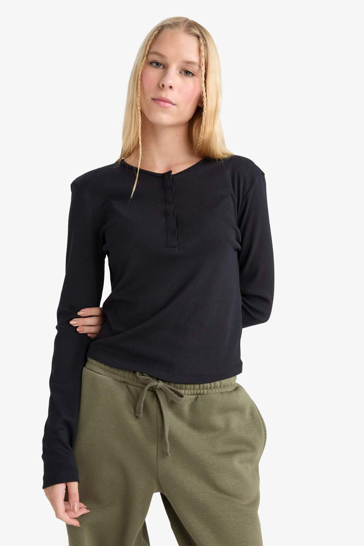 Coool Fitted Düğmeli Yaka Ribana Uzun Kollu Tişört, vücuda oturan kesimi ve düğmeli yaka detayıyla sade şıklık sunar.