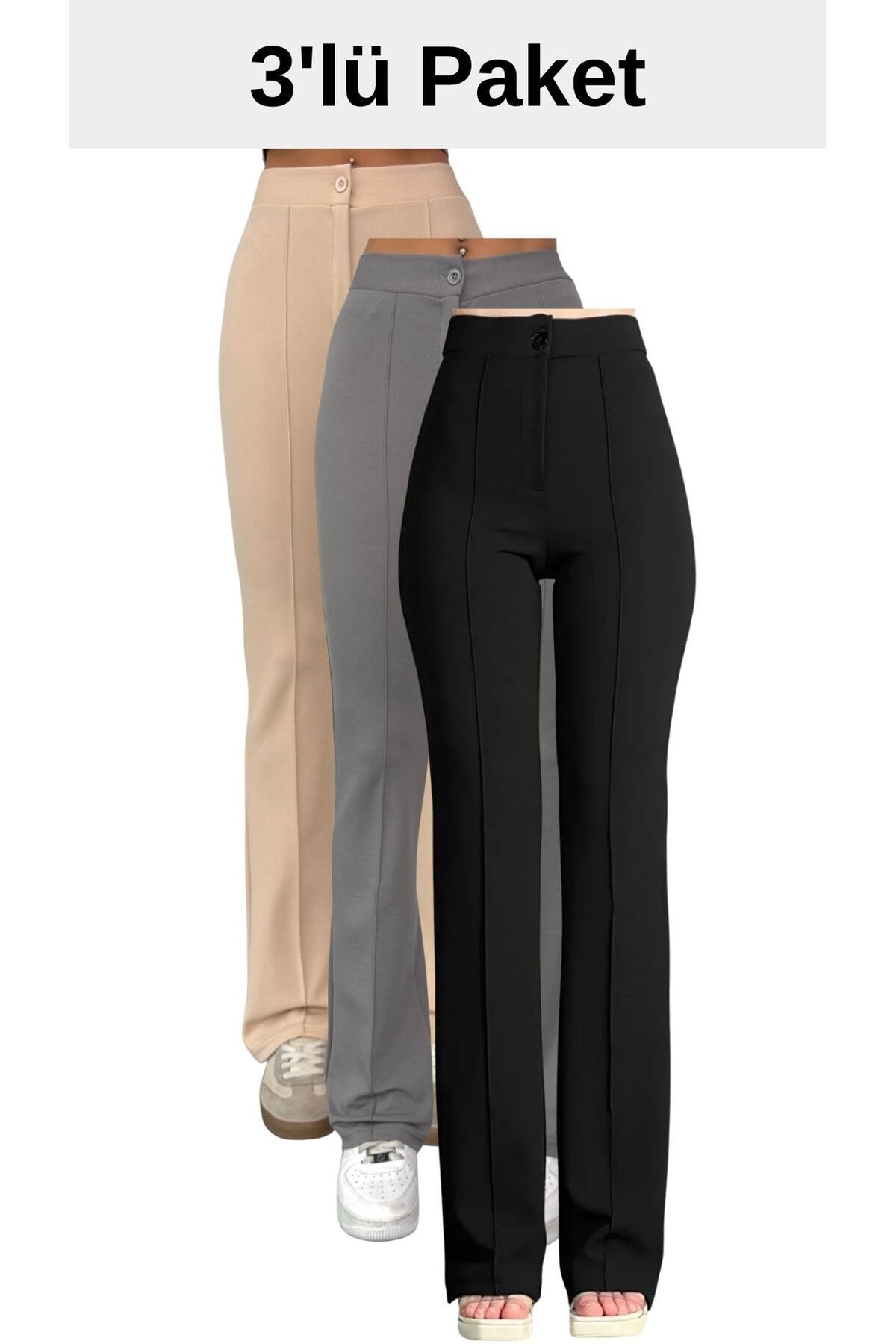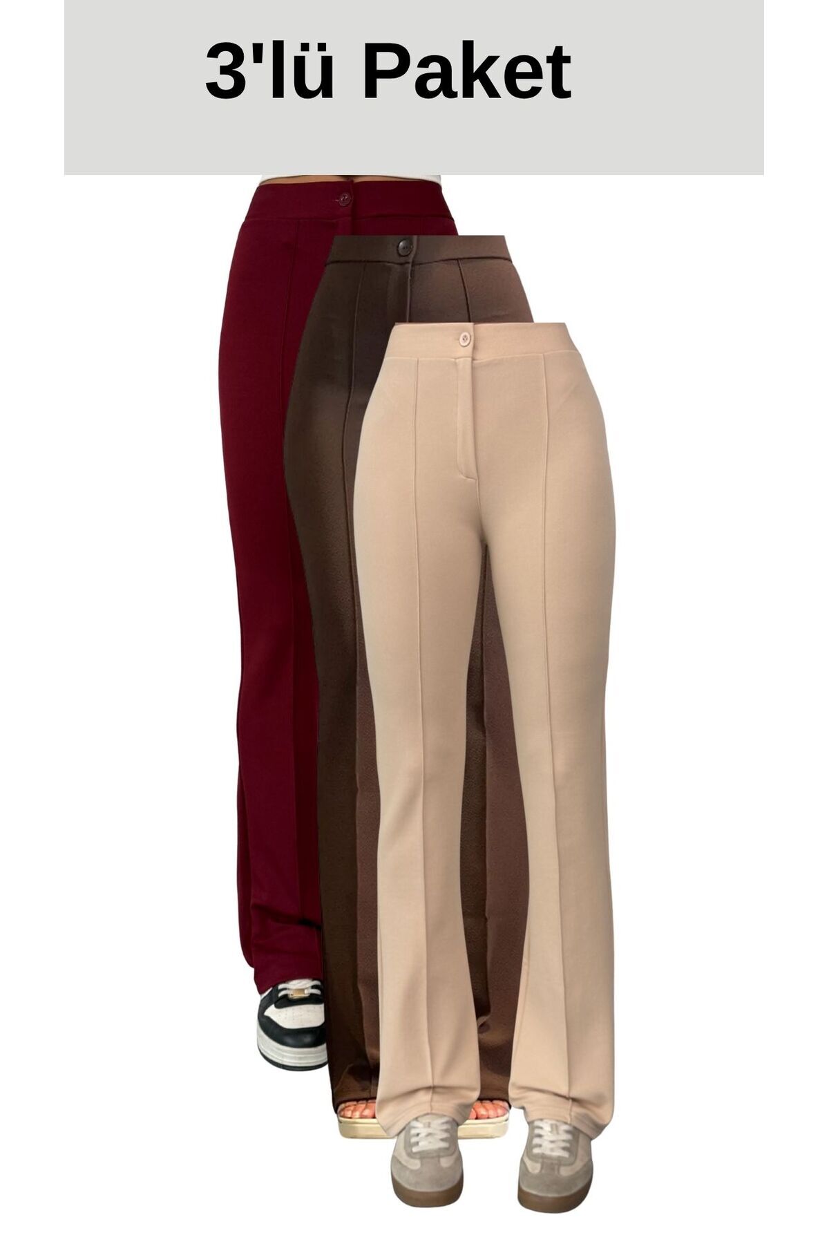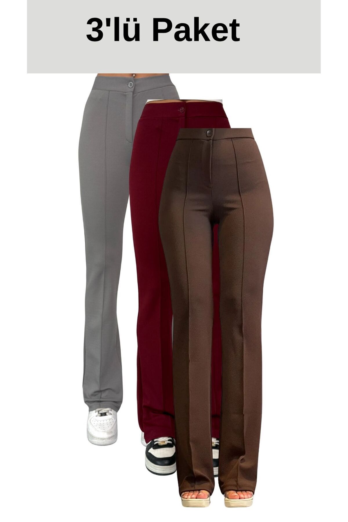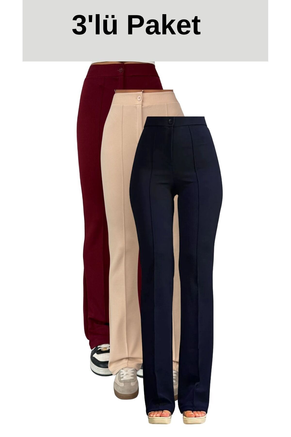 Paket içeriğinde Siyah-Lacivert-Kahverengi renklerde 3 adet pantolon bulunmaktadır.