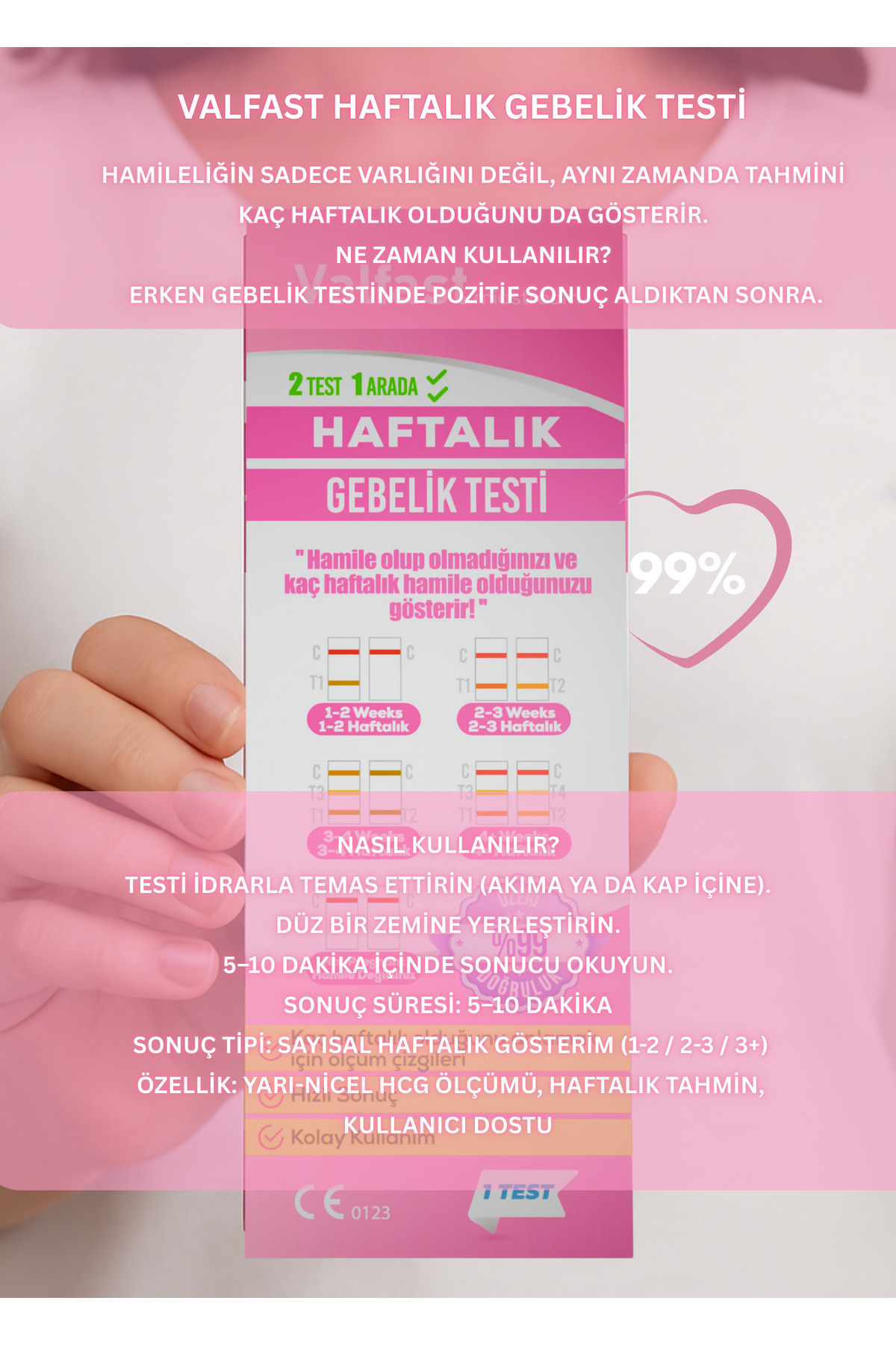 Valfast Haftalık Gebelik Testi, hamilelik durumunuzu öğrenmenize ve HCG seviyenize bağlı olarak hamilelik haftanızı tahmin etmenize olanak tanır.