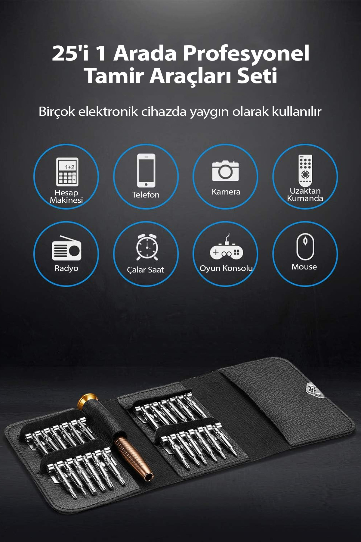 25 Parça Çok Amaçlı Tornavida Tamir Seti ile tüm ihtiyaçlarınızı tek bir sette toplayın.