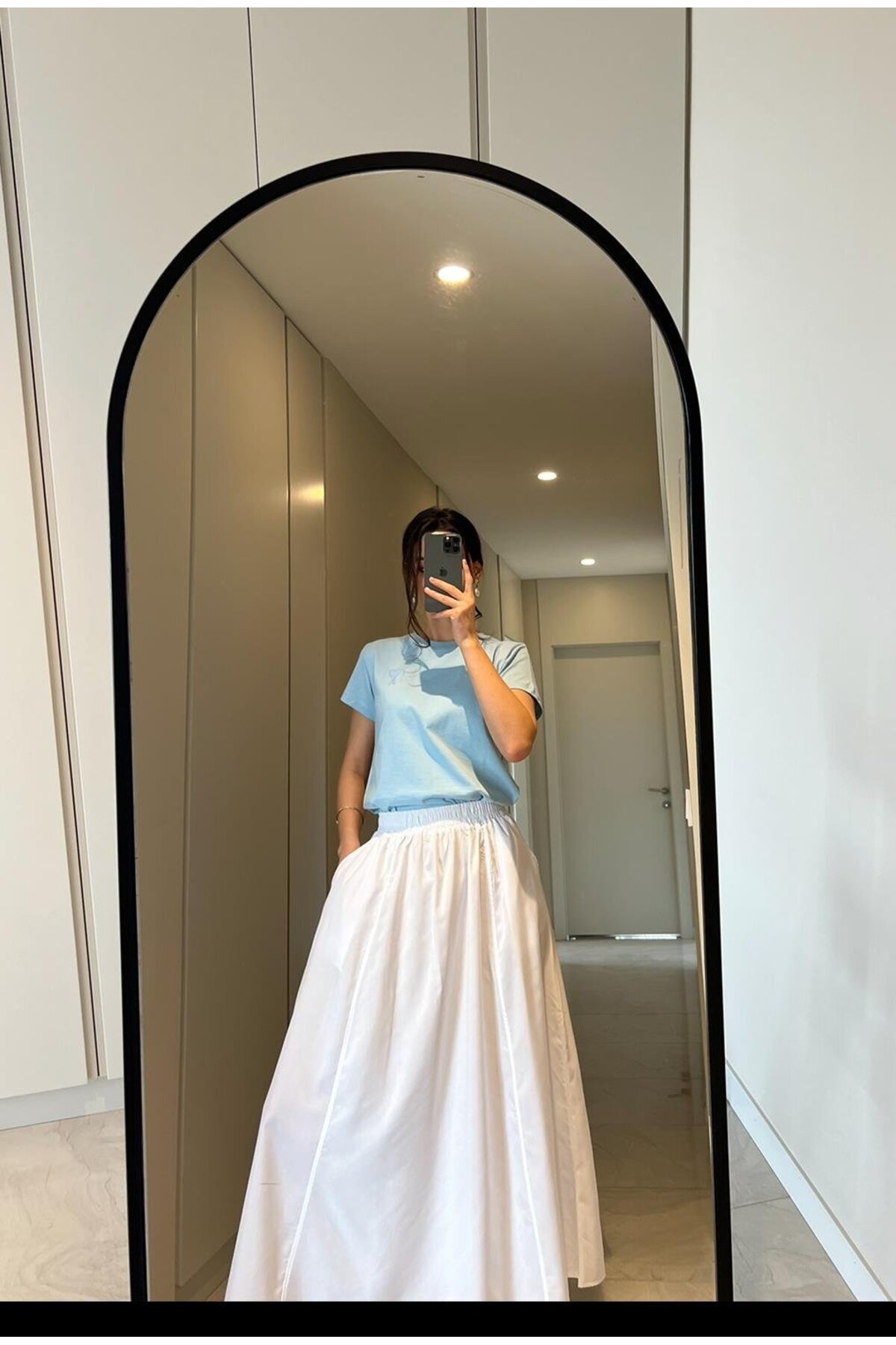 - Kloş silueti sayesinde feminen hatları ön plana çıkaran zarif bir duruş sergiler.