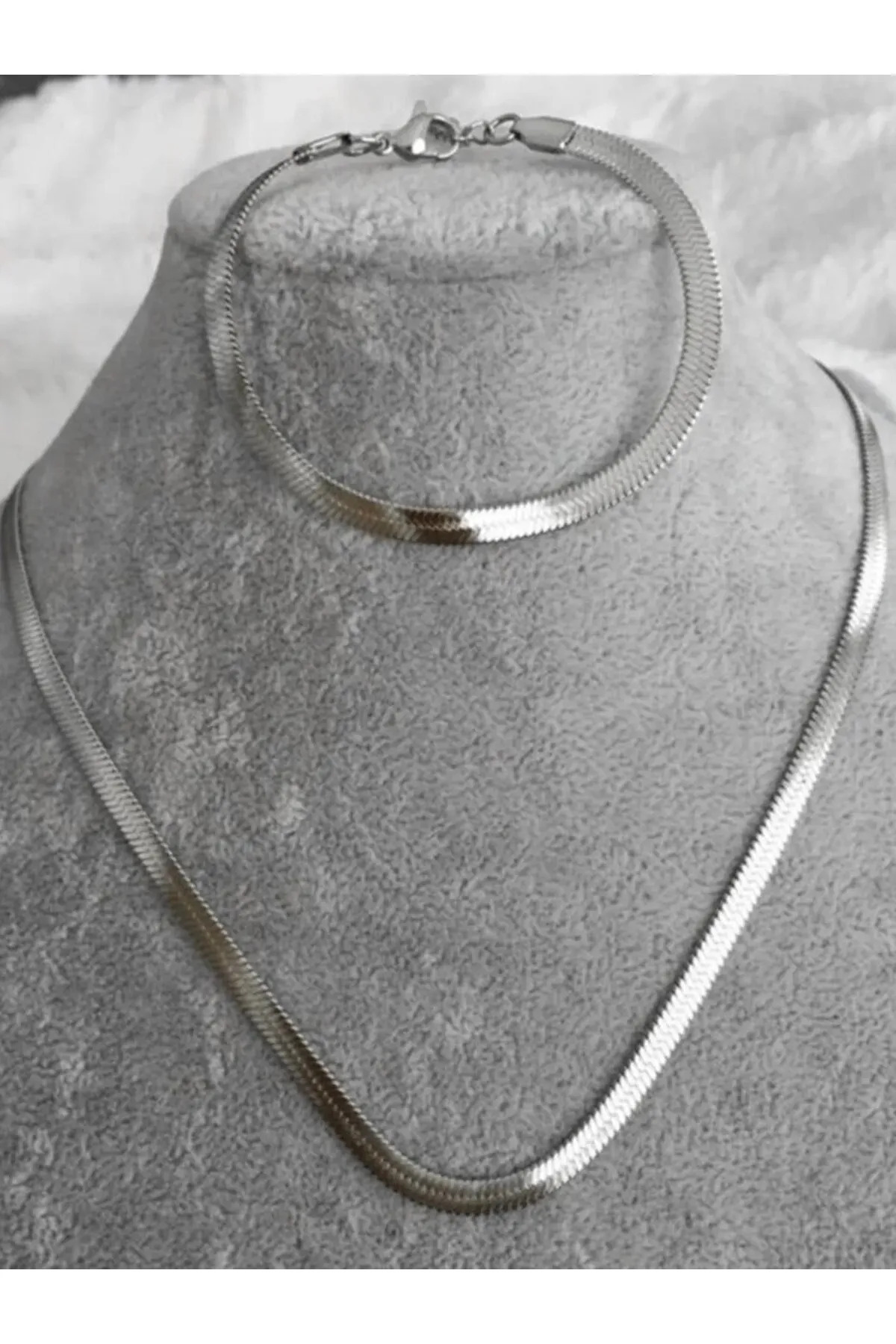 - Taşsız yapısıyla minimalist bir görünüm sergileyen bu bileklik ve kolye seti, sadeliğiyle ön plana çıkar.