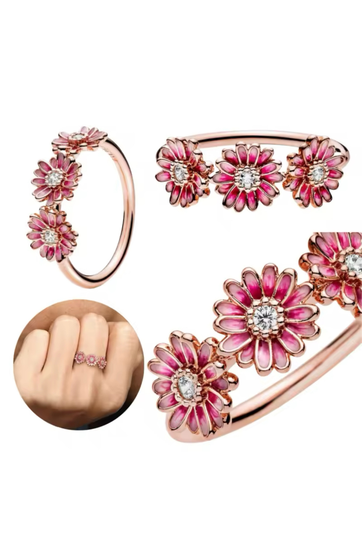 Papatya üçlemesi yüzük pembe kaplama ve benzersiz metallerin karışımından üretilmiştir.
