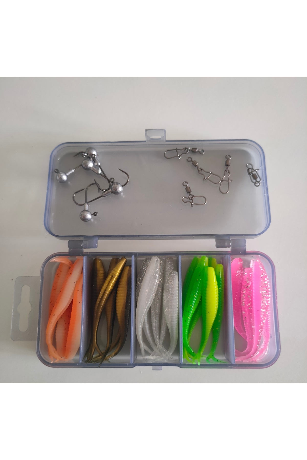 25 ADET 5.5 CM 1 GRAM SİLİKON YEM , 5 ADET ZOKA 2 VE 3 GRAM KARIŞIK 5 ADET FIRDÖDÜLÜ KLİPS BİR ADET SAKLAMA KABI