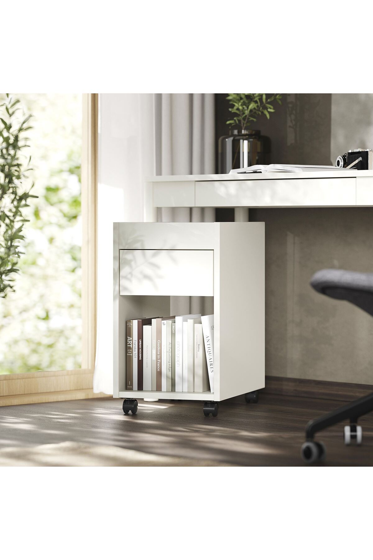 • Sade tasarımlı şık çekmece ünitesi ve ihtiyacınız olan yere taşıyabilmeniz için pratik tekerlekler.