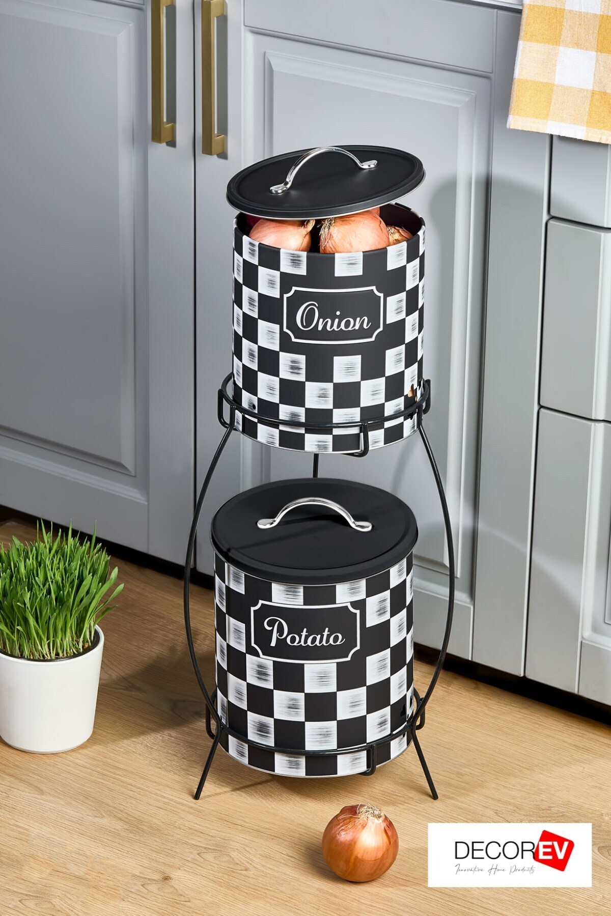 2 Katlı Kulplu Patates Soğanlık Metal Patates Soğan Kovası Sebzelik Sepeti Dama Desenli