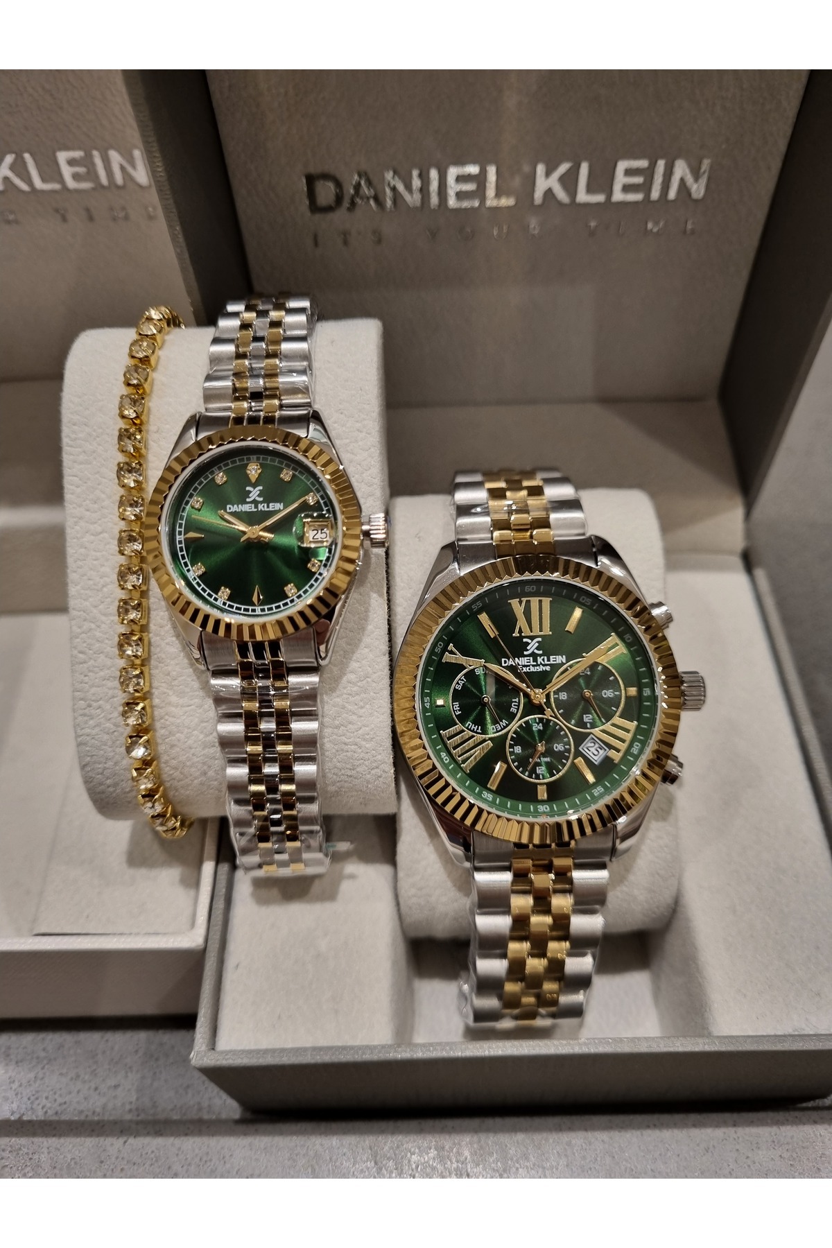 Sarı Çelik Bilezik Yeşil kadran Sevgili Kol Saati 2 li