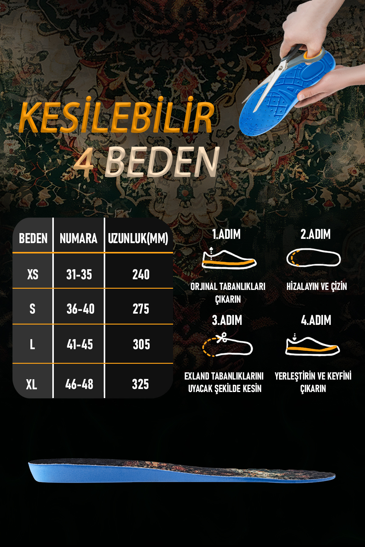 Kesilebilir Tasarım: Ayakkabınıza tam uyum sağlamak için istediğiniz numaraya göre kesebilirsiniz.