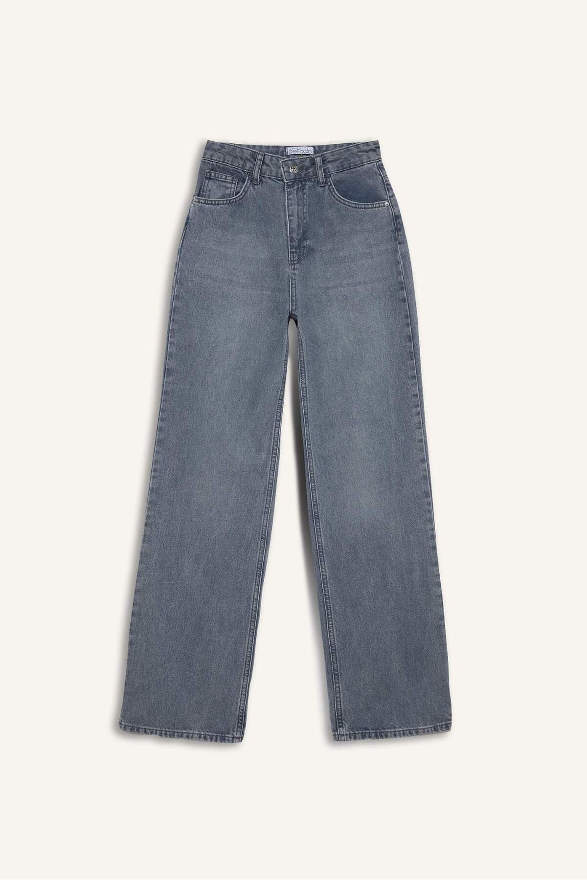 Kadın gri jean pantolon, yüksek bel ve straight wide kalıpla tasarlanmıştır.