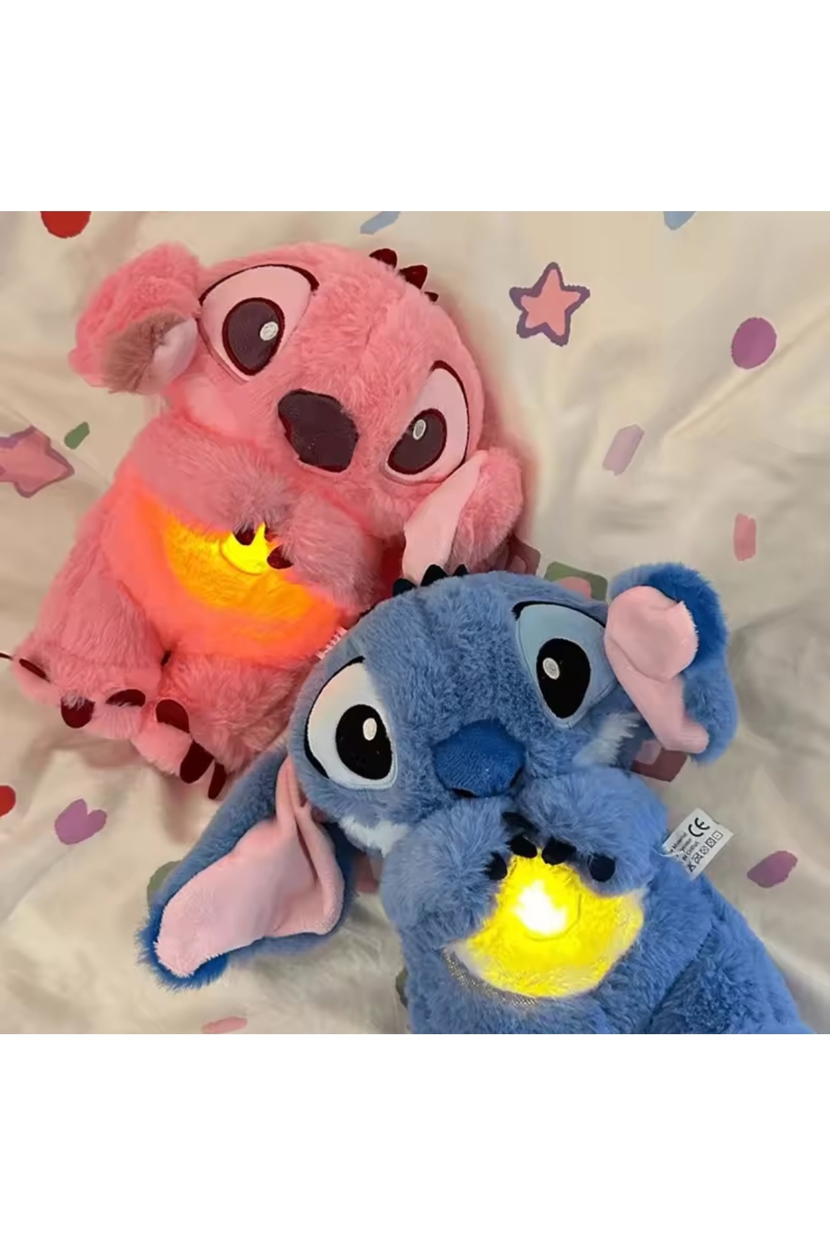Pembe renk lilo stitch peluş oyuncak karnı nefes alan müzikli ışıklı uyku arkadaşı.