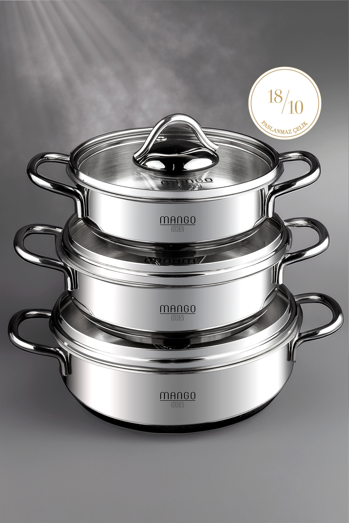 Snippy Mango Kitchen - Silver 6 Parça Paslanmaz Çelik Sahan Seti (16-18-20 CM) 18/10 Paslanmaz Çelik