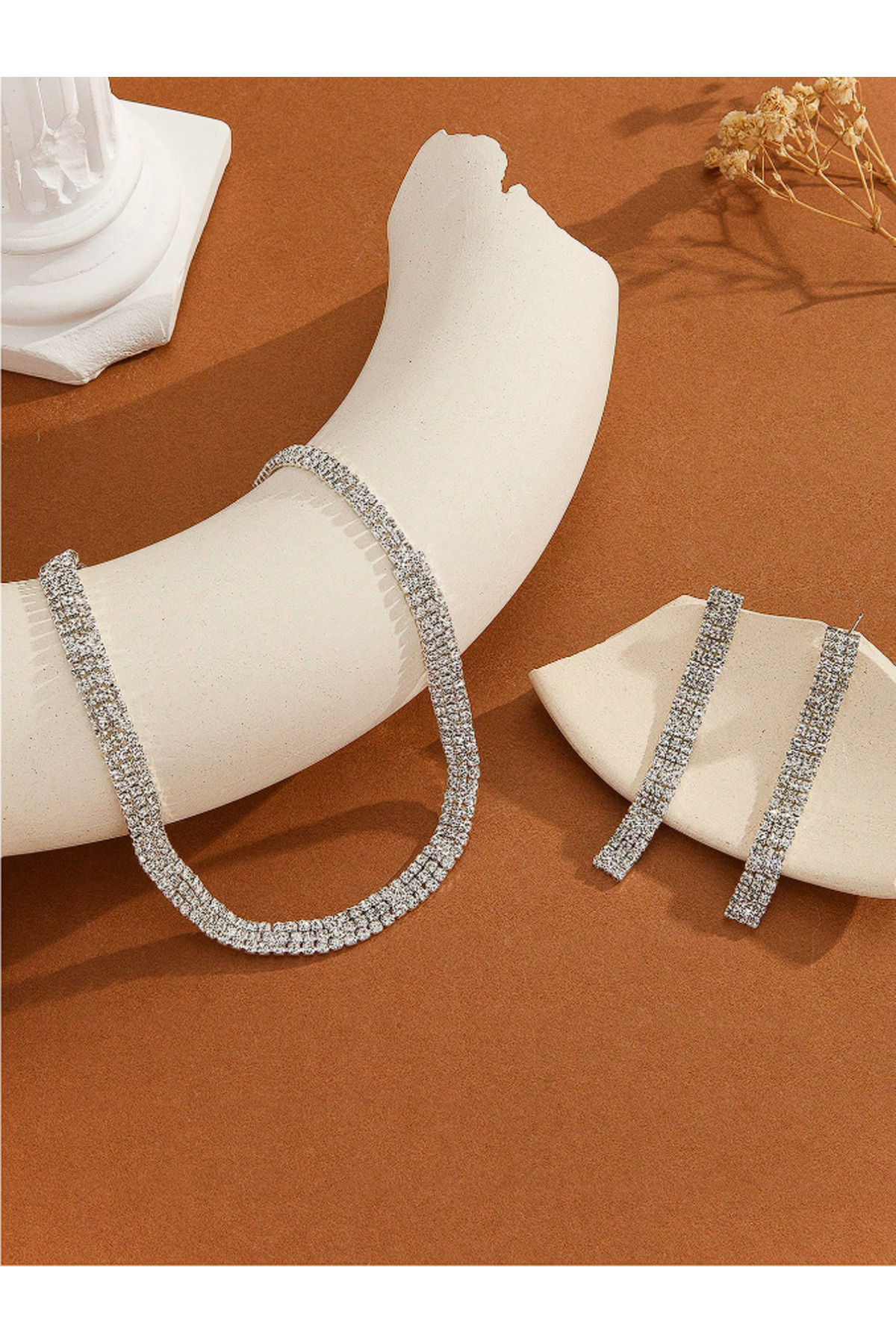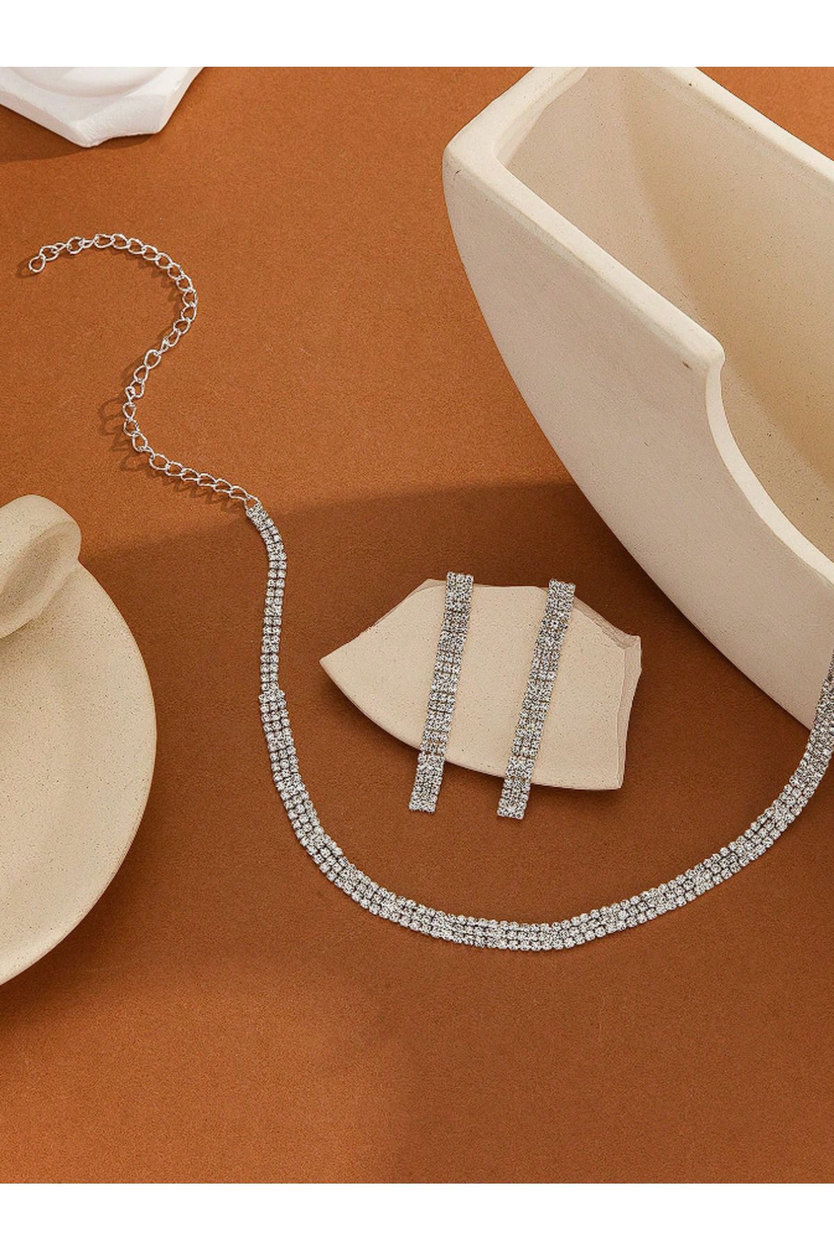3 Sıralı 2 Sıraya Dönen Şık Zirkon Taşlı Su Yolu Silver Kolye Küpe Set