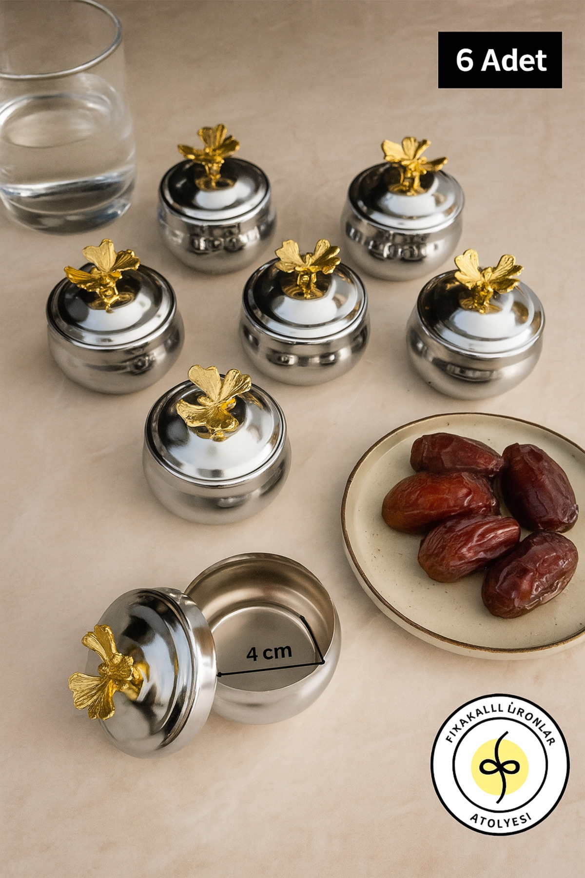 - Altının asaletini yansıtan 6'lı gold kelebekli tombik lokumluk seti, çay ve kahve sunumlarınıza şıklık katıyor.