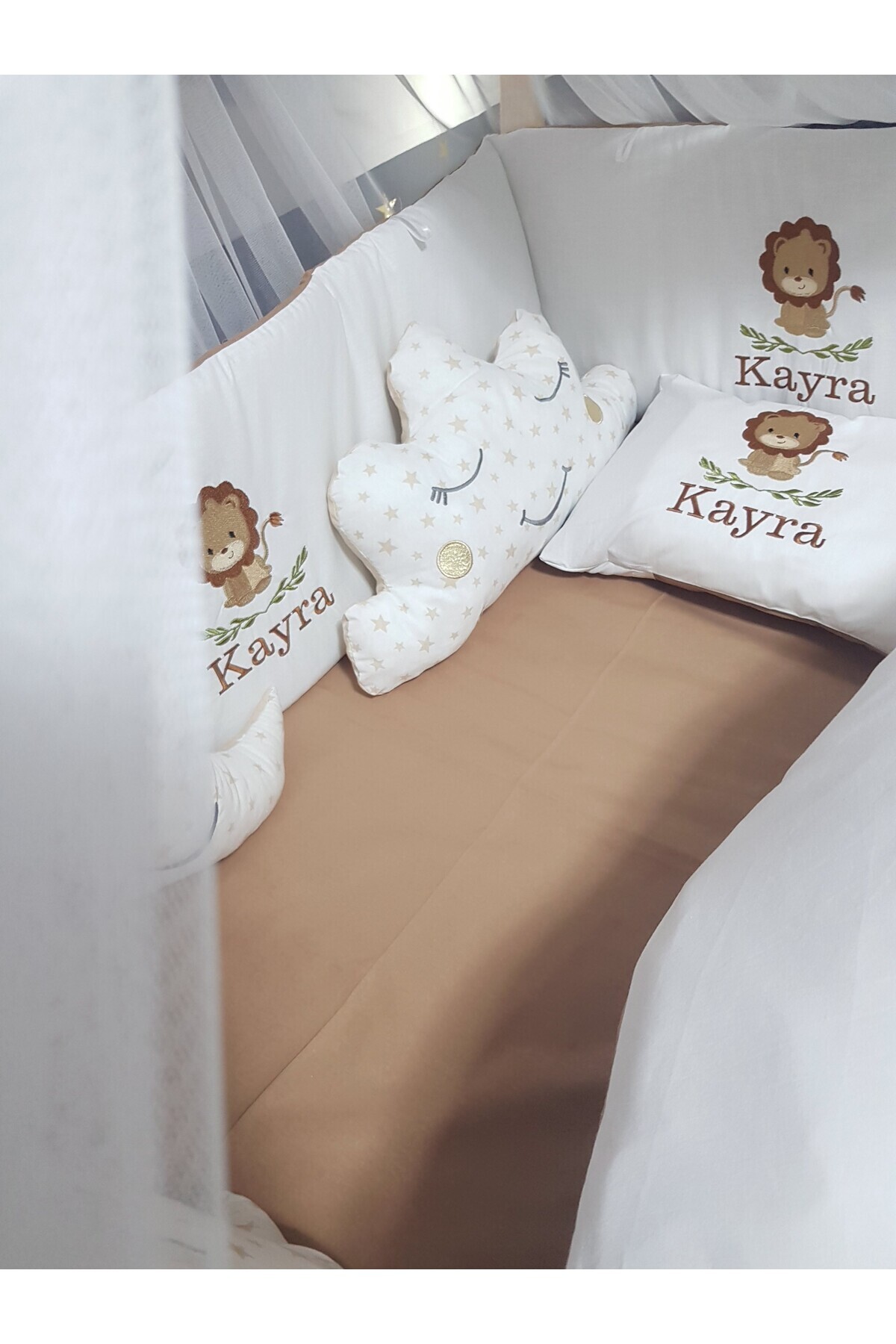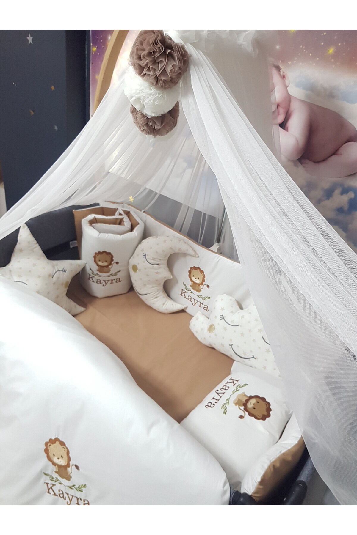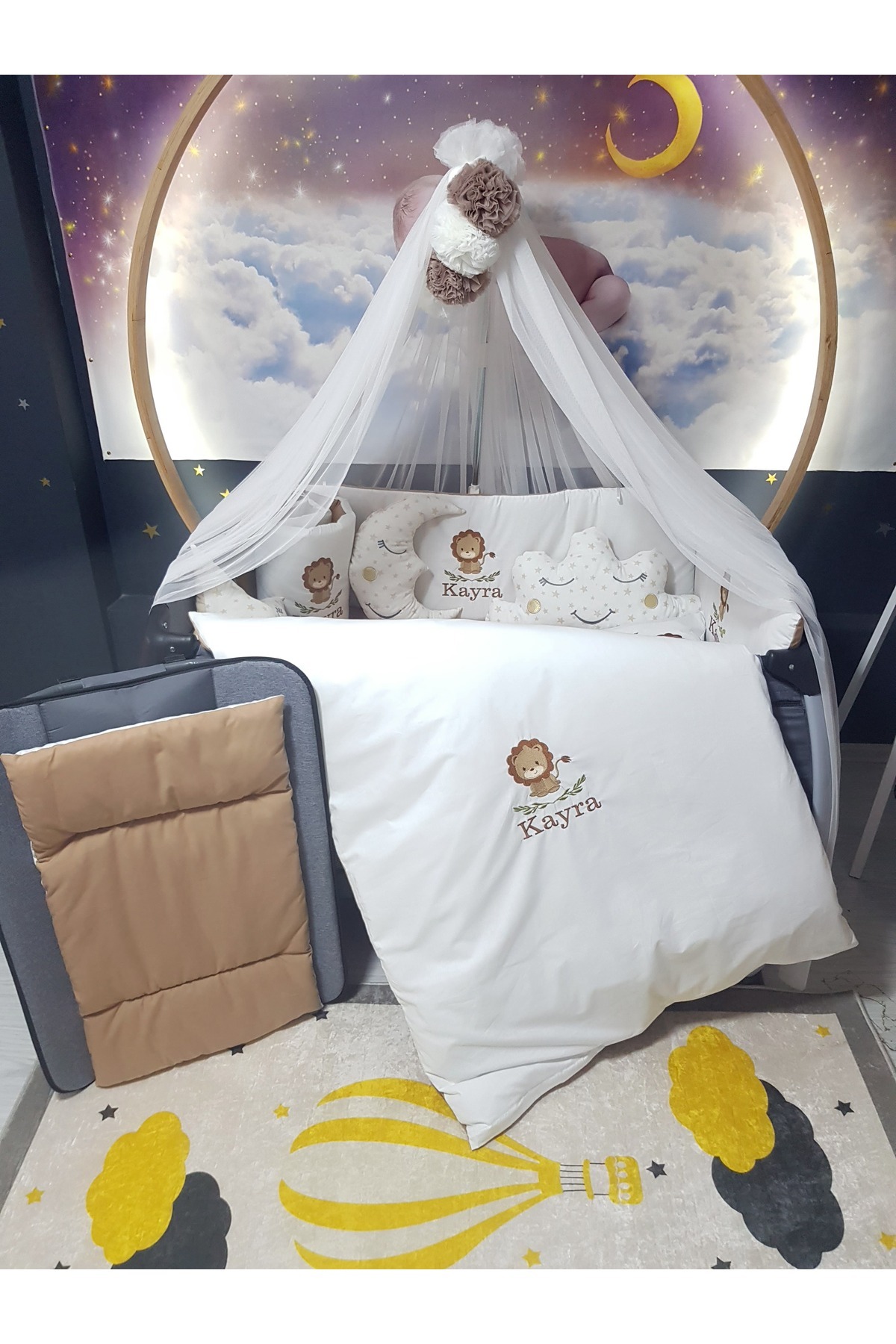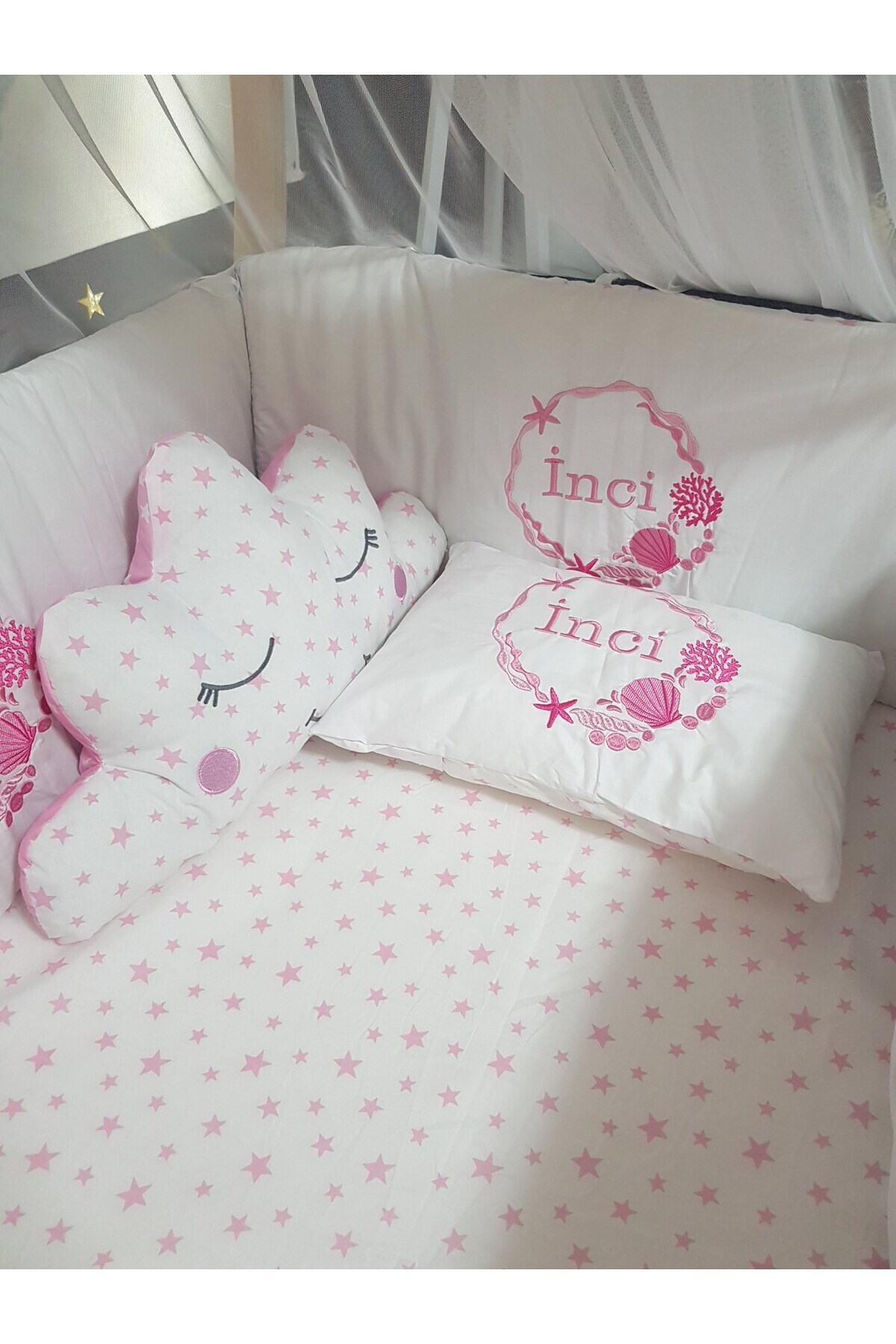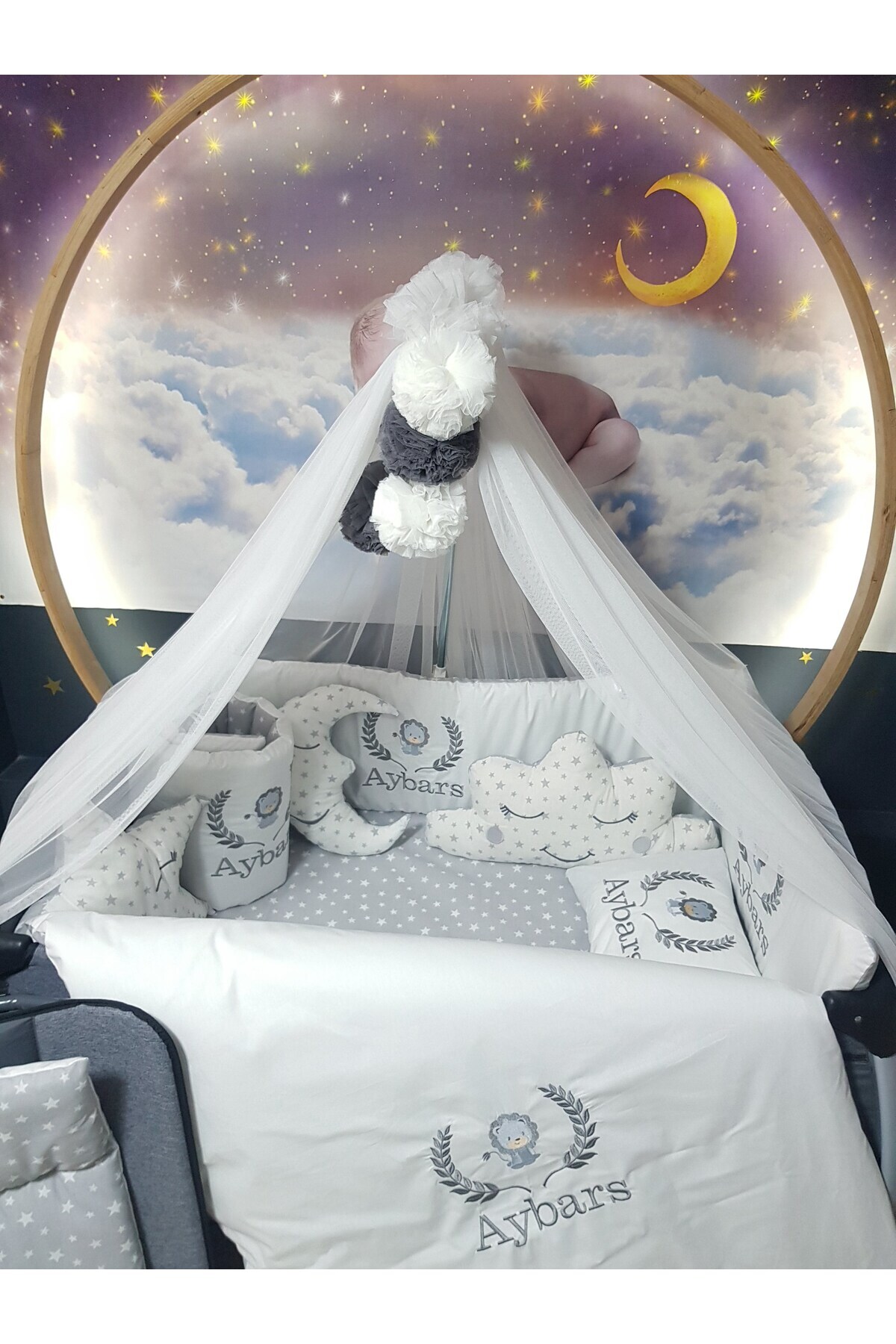 NAKIŞLI UYKU SETİ İÇERİĞİ (Toplam 18 Parça): 2 Adet Yan Koruma (30x110 cm), 1 Adet Baş Koruma (30x70 cm), Yorgan ve Kılıfı (80x110 cm), Yastık ve Kılıfı (30x45 cm), Çarşaf, Alt Açma Minderi (40x70), Ay Bulut Yıldız Uyku Arkadaşları (40x45 cm), Lüks Cibinlik (170x600 cm), 4 adet Cibinlik Ponponu, Cibinlik Aparatı (40x80)