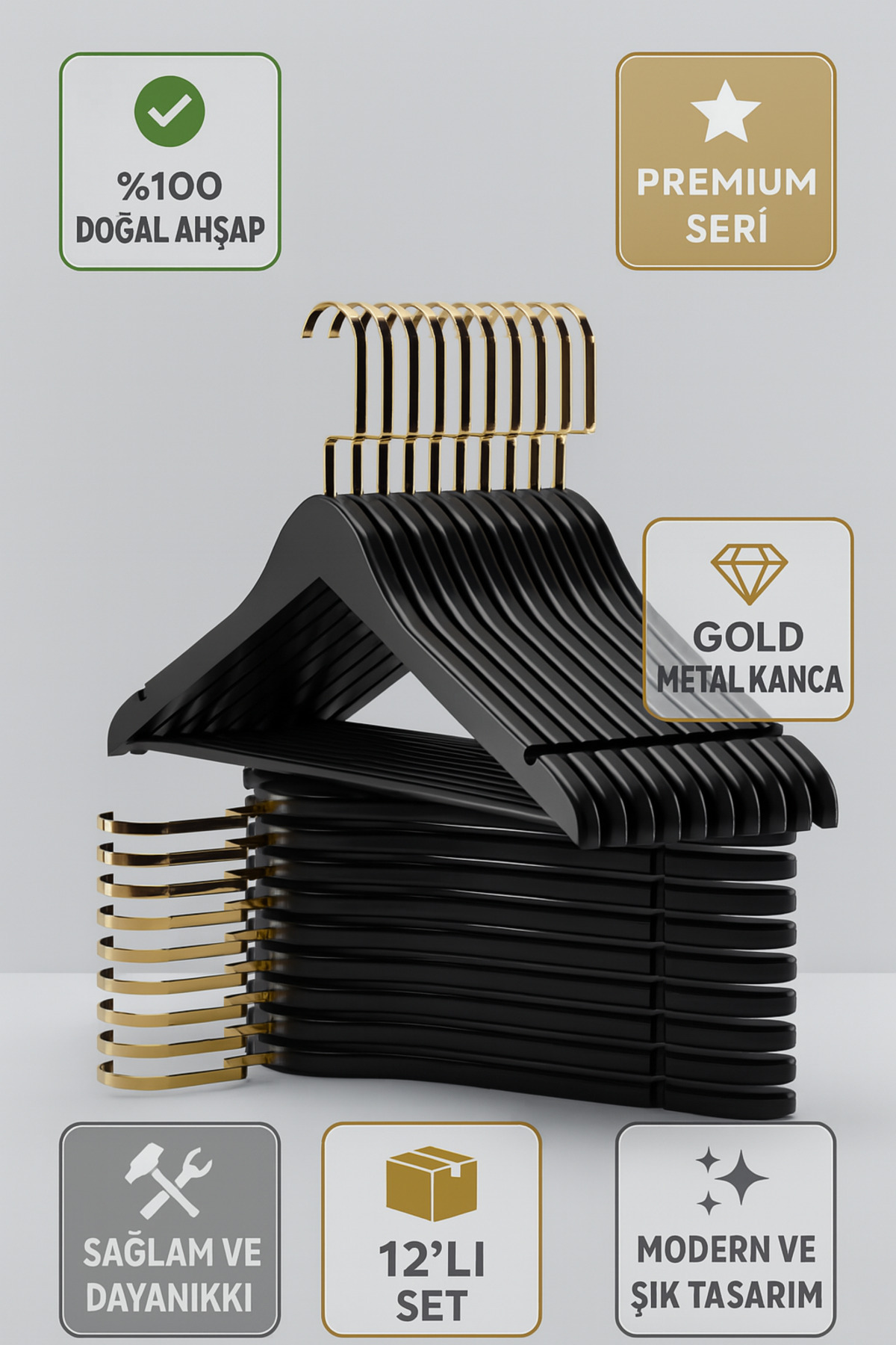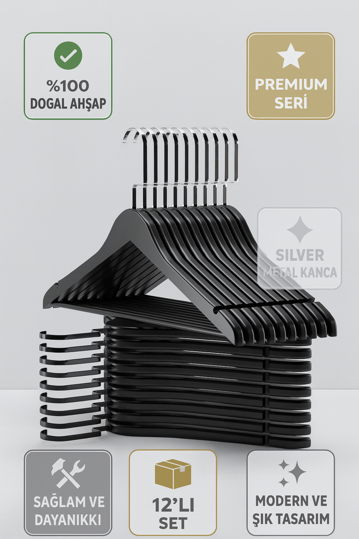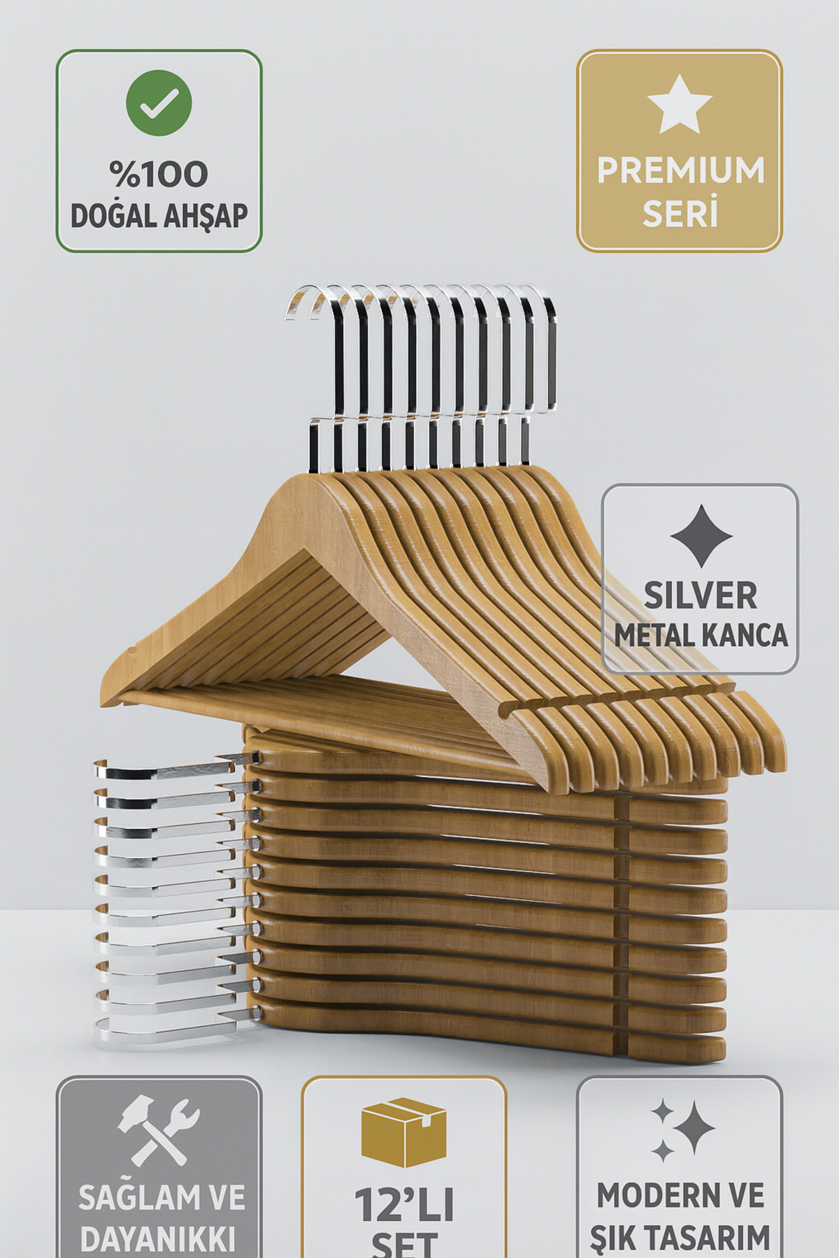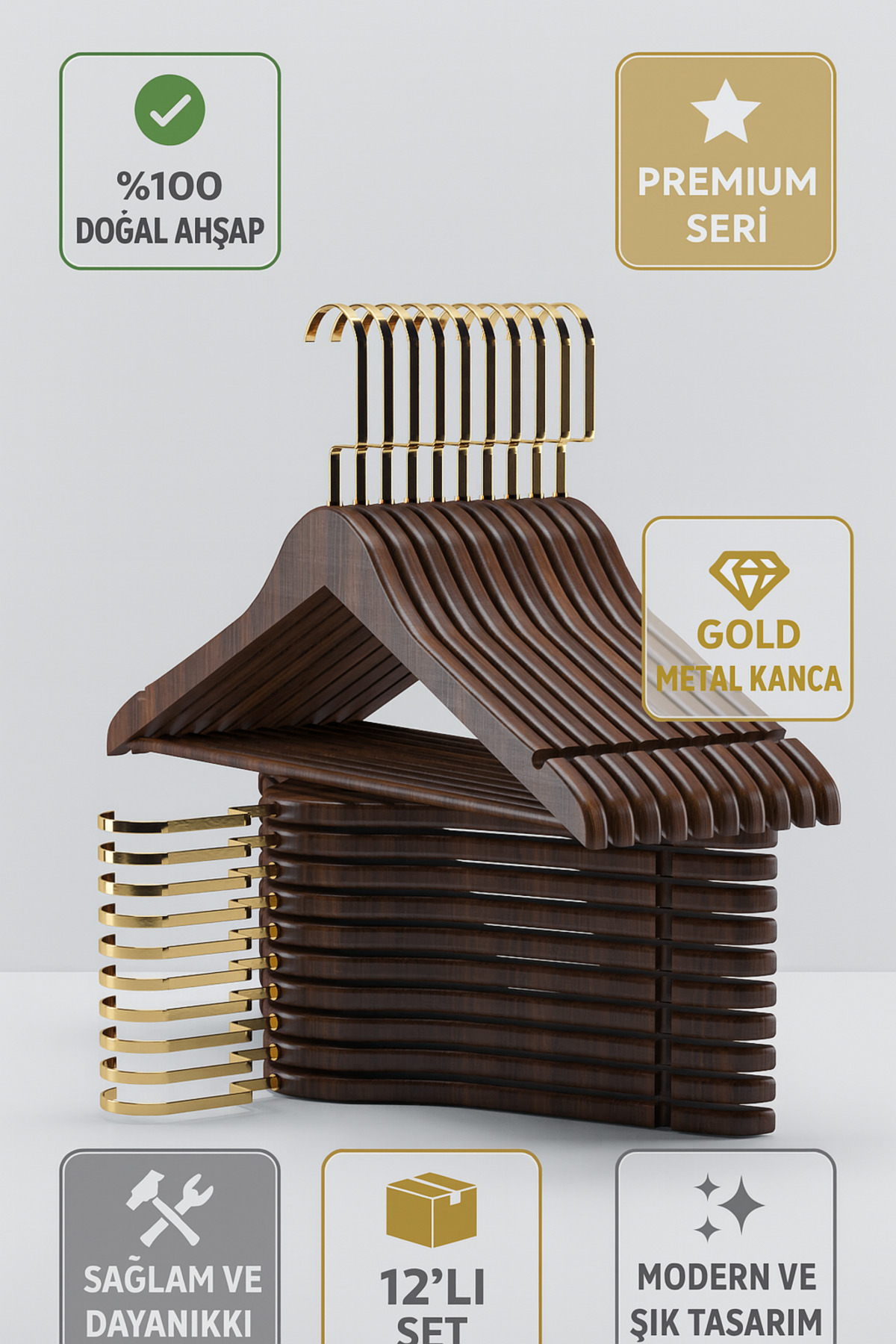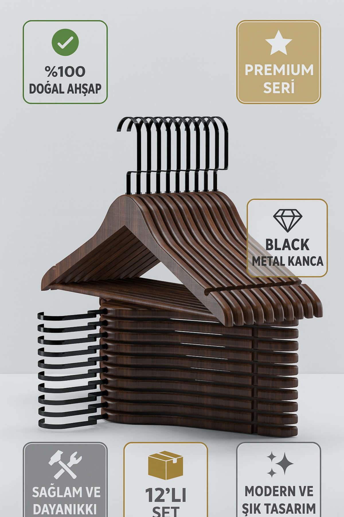 Ceviz Ahşap Askı Kıyafet Elbise Gömlek Ve Pantolon Askısı Lüks Amerikan Kanca Askı 12 Adet