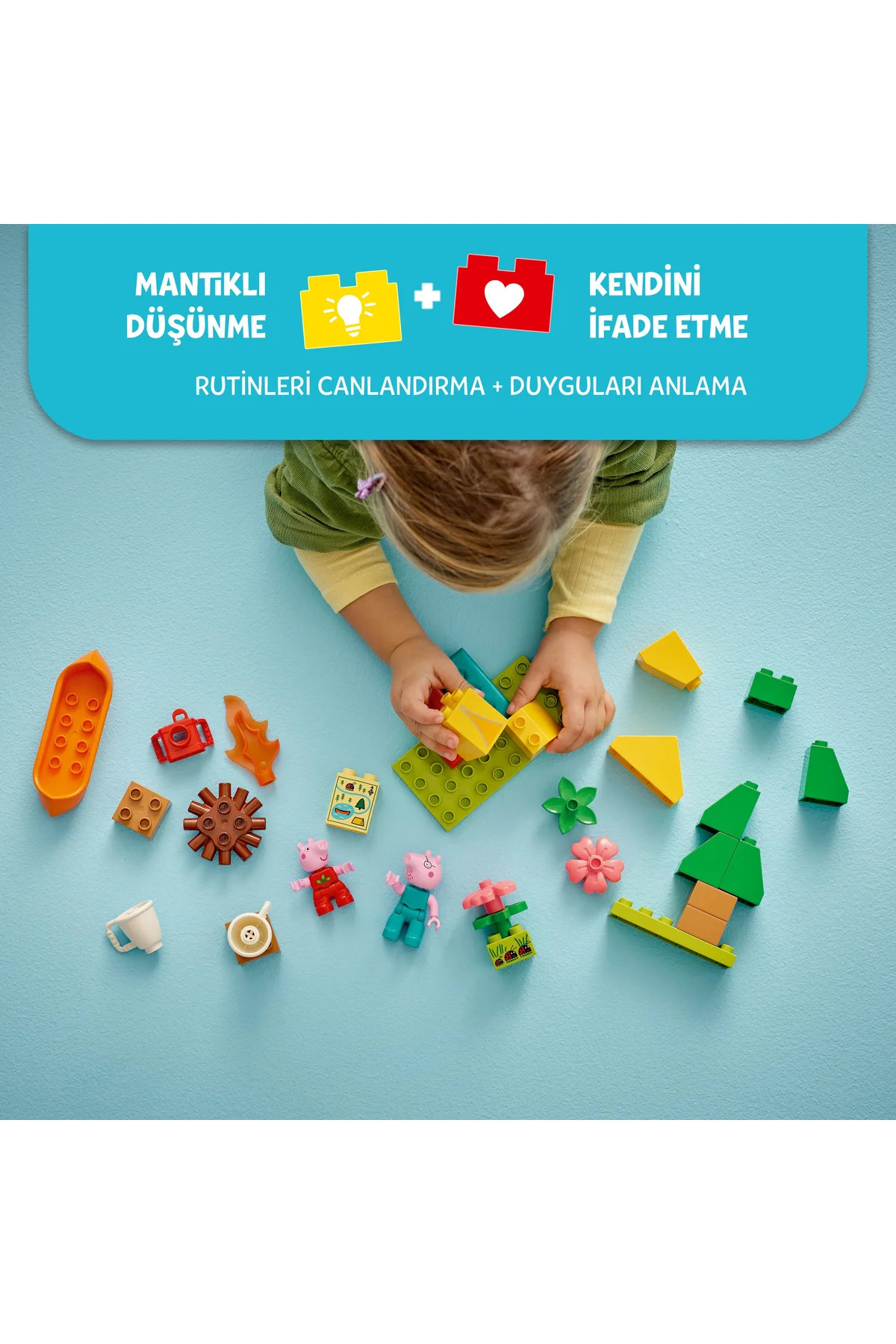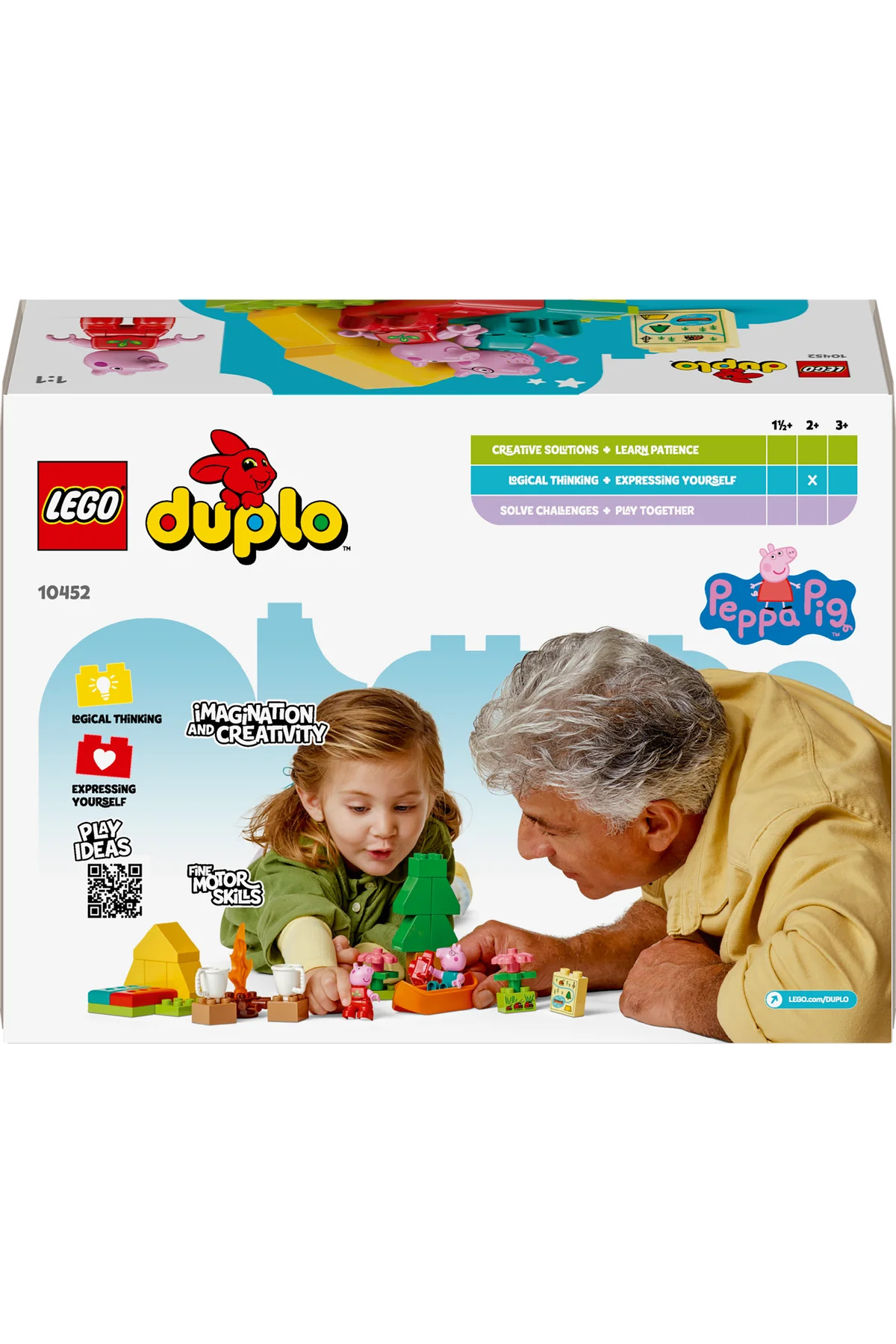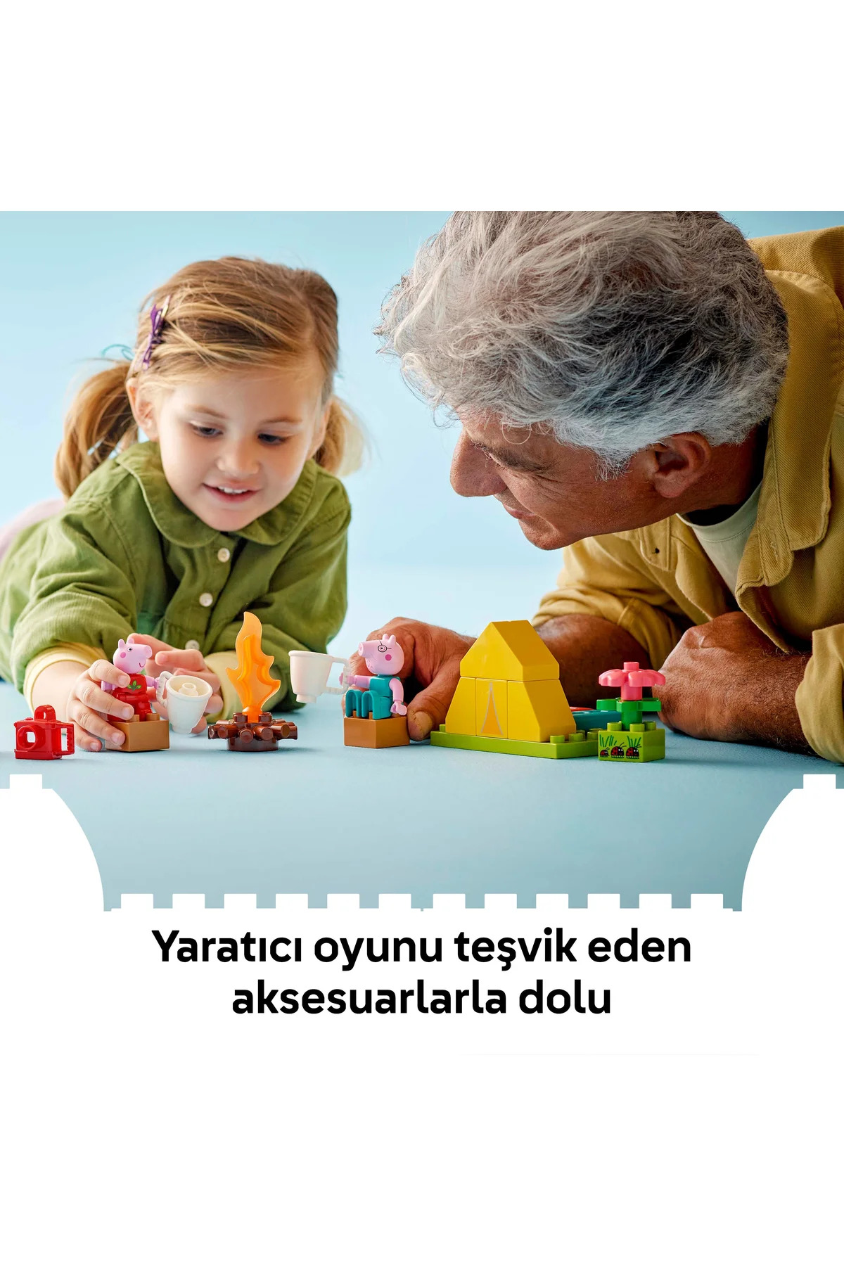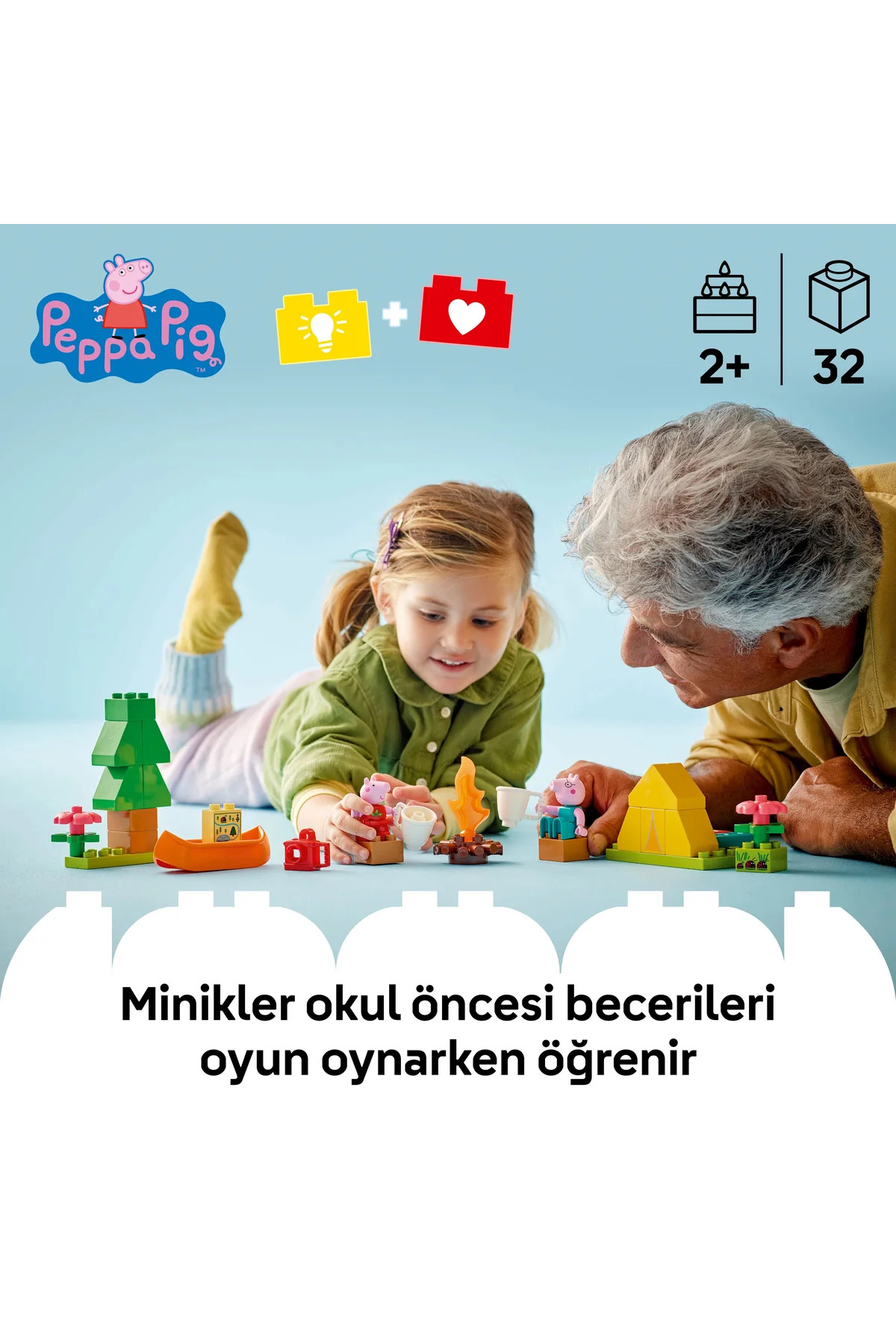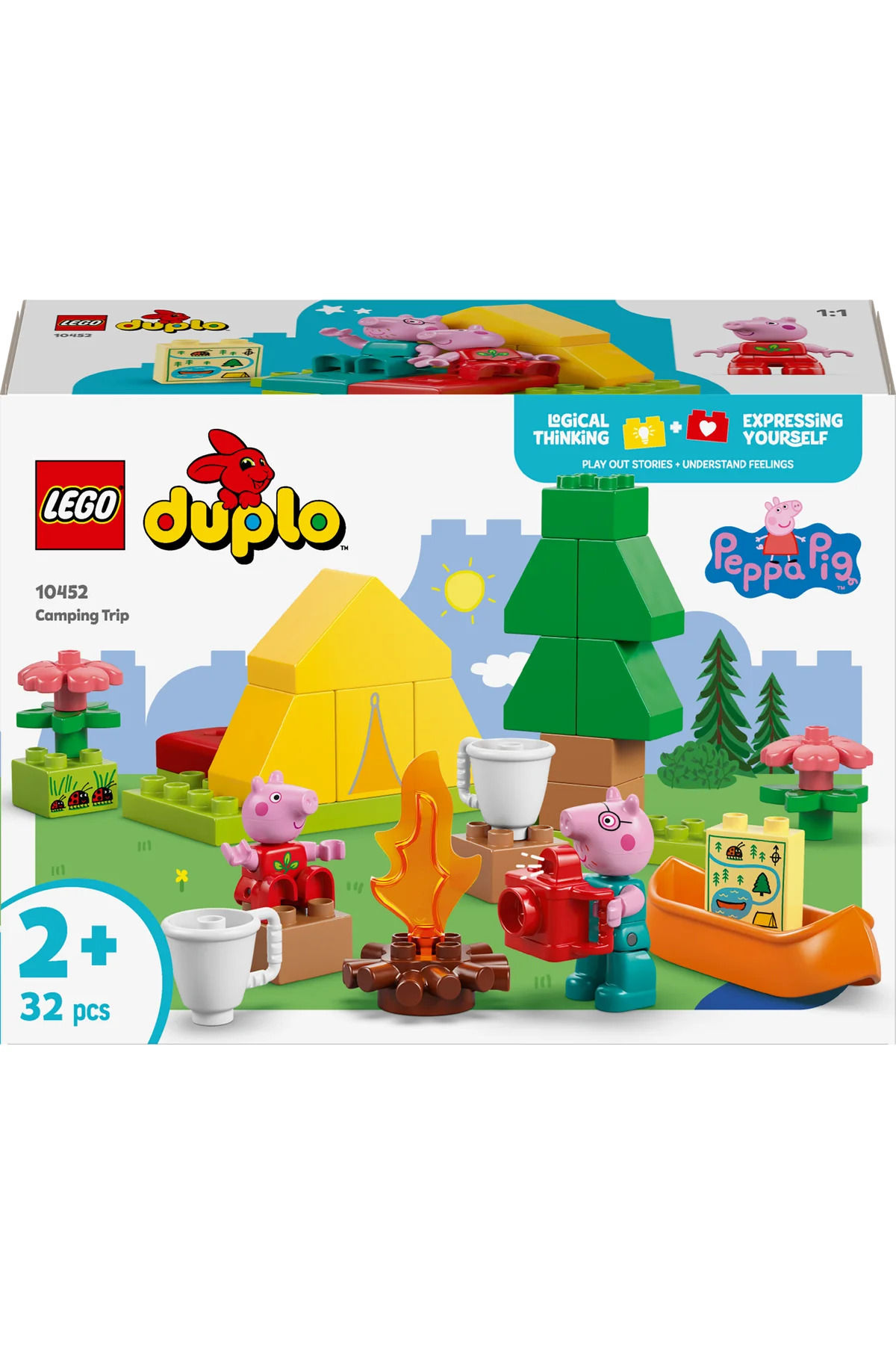 Küçük çocuklar, Kamp Gezisi (10452) yapım setiyle bir LEGO DUPLO Peppa Pig macerasına atılır. Okul öncesi yaştaki kız ve erkek çocuklar, yaratıcı oyunlarla Peppa Pig ve Baba Pig ile kamp yaptıklarını hayal ederken ilk kez yaşadıkları deneyimler hakkında ne hissettiklerini keşfeder, sonra oyuncak kanoyla nehri keşfeder. 2 yaş ve üzeri çocuklar için bu yaratıcı Peppa Pig oyuncağı, çok sayıda eğlenceli aksesuar içerir. Küçük çocuklar, Peppa ve Baba Pig’in oyuncak kanoda yaşayabileceği heyecan verici maceralar icat ederken, mantıklı düşünmeyi teşvik etmek için 2 uyku tulumlu bir oyuncak çadır, kamp ateşi, 2 kupa ve harita bulunur. Çocuklar, oyuncak haritadaki parçaları inşa ederken küçük kas becerileri gelişir. Doğada vakit geçirebilir, uğur böcekleri bulabilir ve oyuncak kamerayla tatil fotoğrafları çekebilirler. Küçük çocuklar için eğitici ve kaliteli Peppa Pig oyuncağı, okul öncesi çocuklarla ilk kez çadırda uyurken hissedebilecekleri duygular hakkında konuşmaya başlamanın harika bir yoludur. Bu konuşmalar aynı zamanda öz güven kazandırmaya yardımcı olur, böylece minikler kendilerinin de Peppa kadar maceracı olabileceğini düşünmeye başlar!