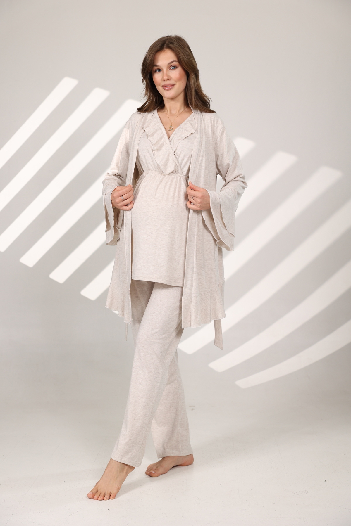 - Kruvaze açılarak emzirme kolaylığı sağlar - Sabahlık %90 Pamuk, %10 Viskon - Pijama Takımı : %90 Pamuk, %90 Viskon- Manken üzerindeki beden M- Yumuşak dokusuyla konforlu bir uyku deneyimi sunan pamuk materyali sayesinde gün boyu rahatlık hissi verir.