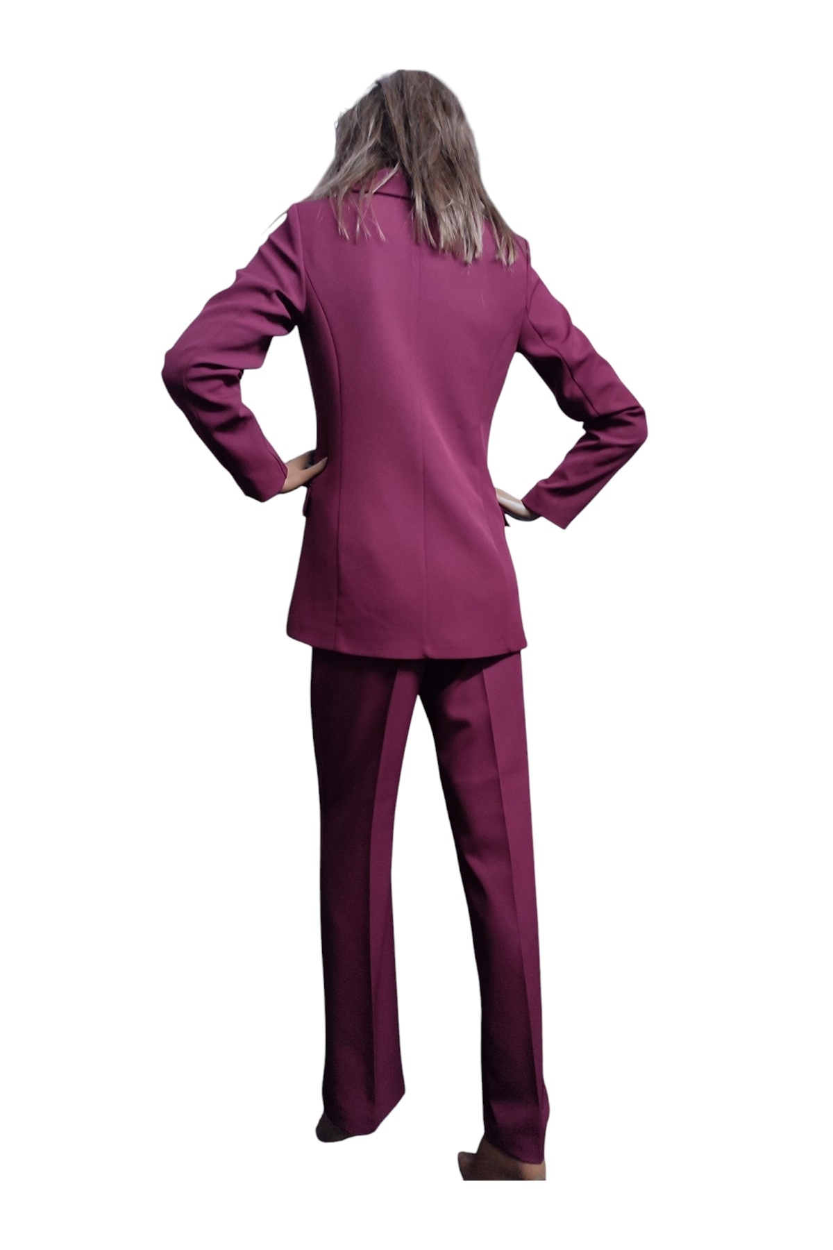 - Zarif bordo tonlarında, her ortama uyum sağlayan şık bir görünüm sunan bordo kadın 6 düğmeli ceket pantolon takım.