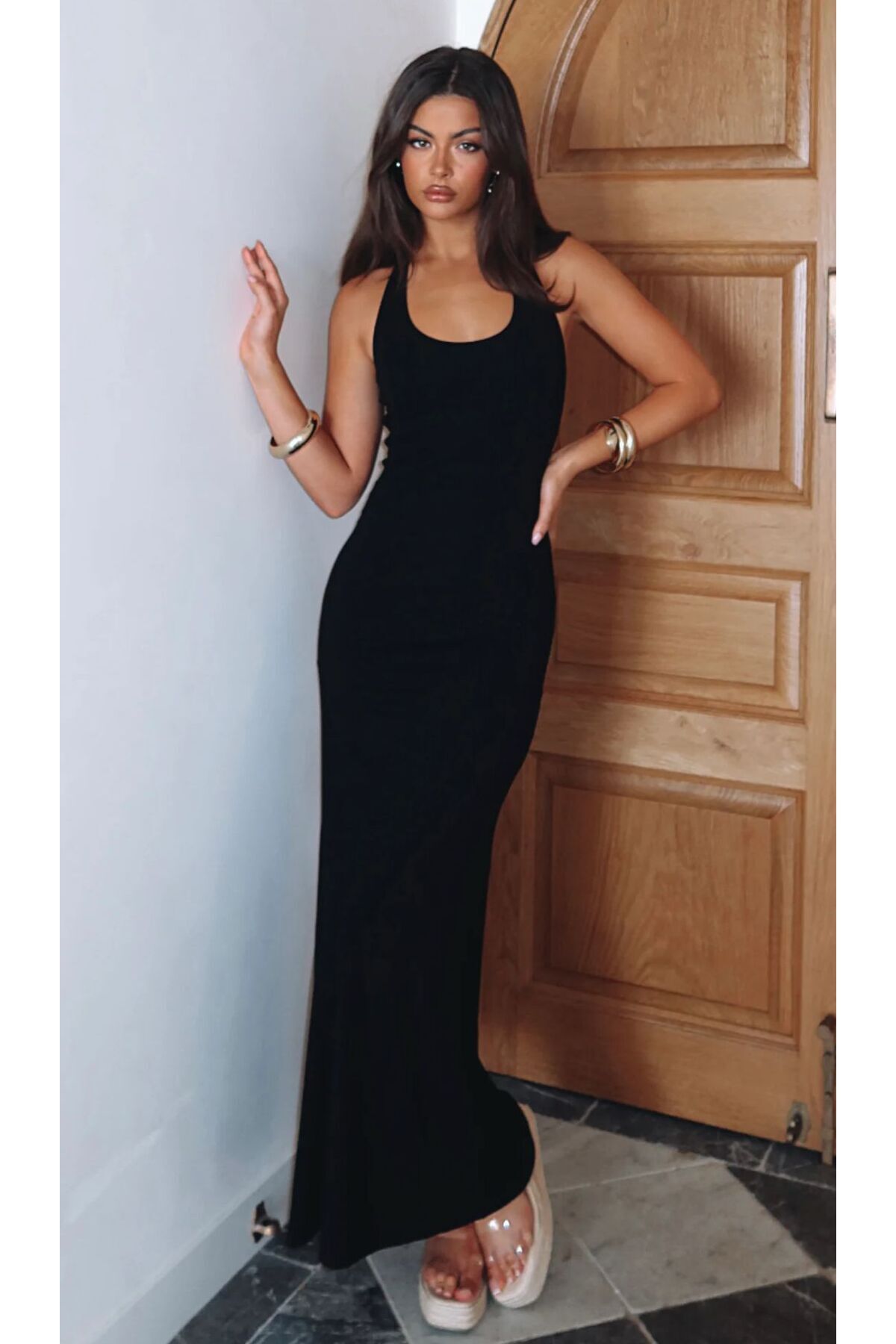 - Siyah renk seçeneğiyle şıklığı ve zarafeti ön plana çıkaran boyundan bağlamalı kollusuz elbise, her ortamda dikkat çekici bir görünüm sunar.
