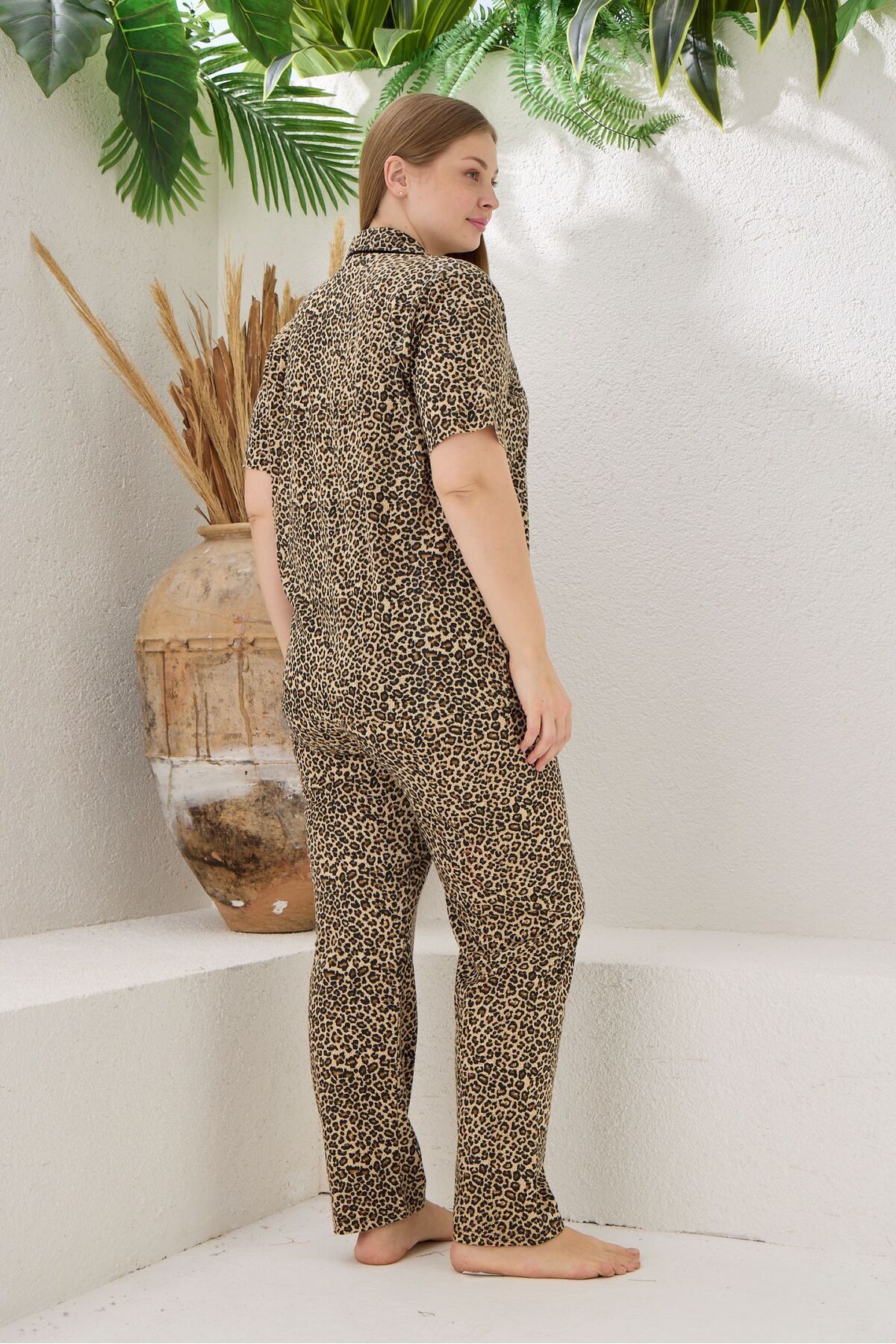 - Rahat kesimiyle günlük kullanım için ideal, leopar desenli ara biyeli cepli pijama takımı.