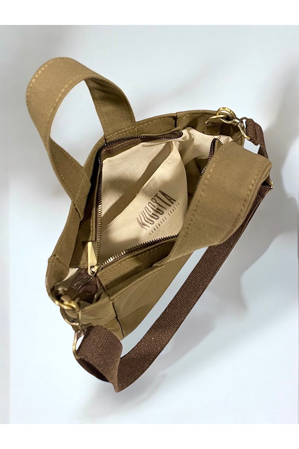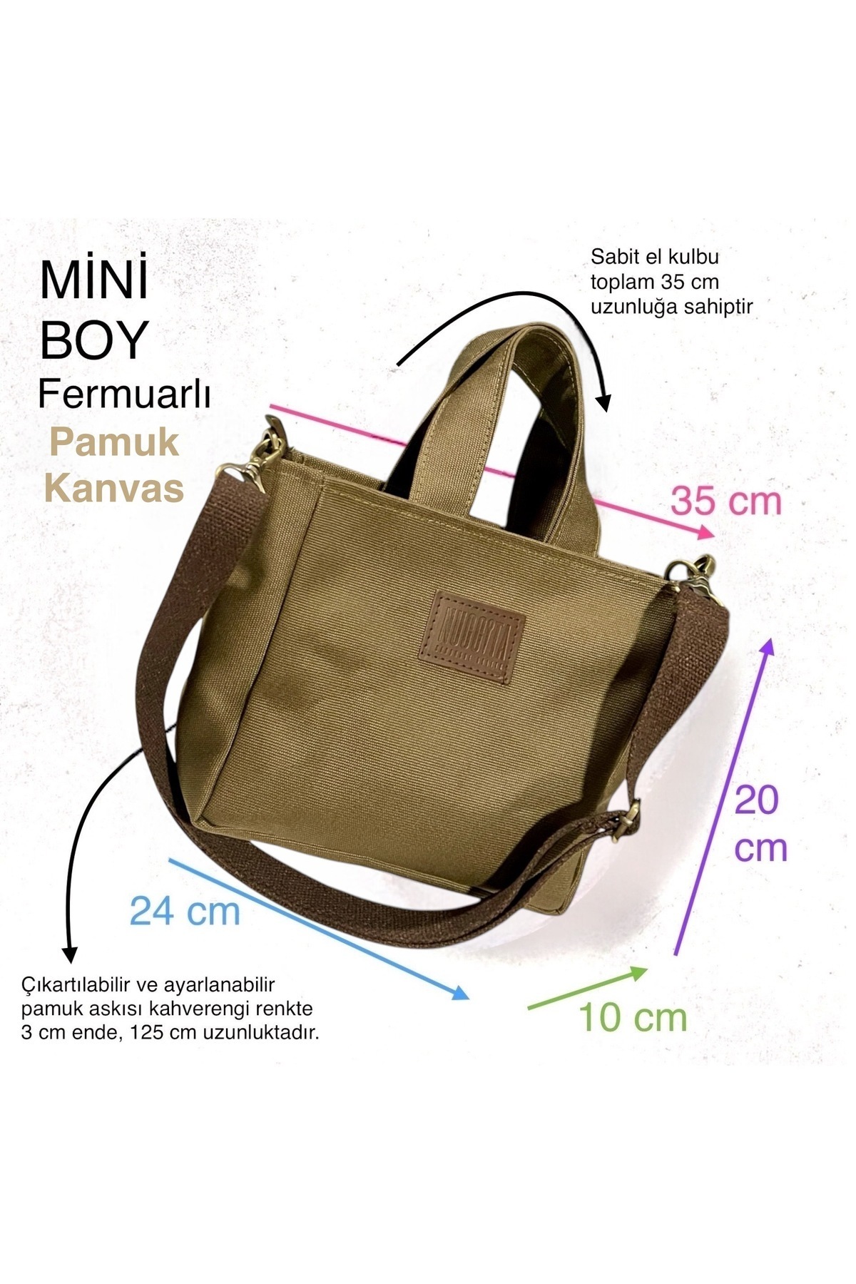 Pamuk Kanvas kumaş mini boy çantadır.