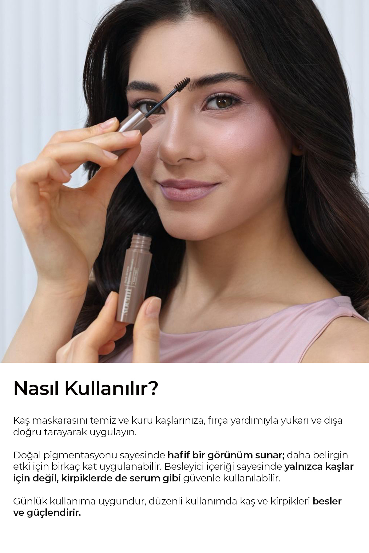 Kullanımı: Kaşları, maskara fırçası yardımı ile yukarı doğru hareketlerle fırçalayınız.