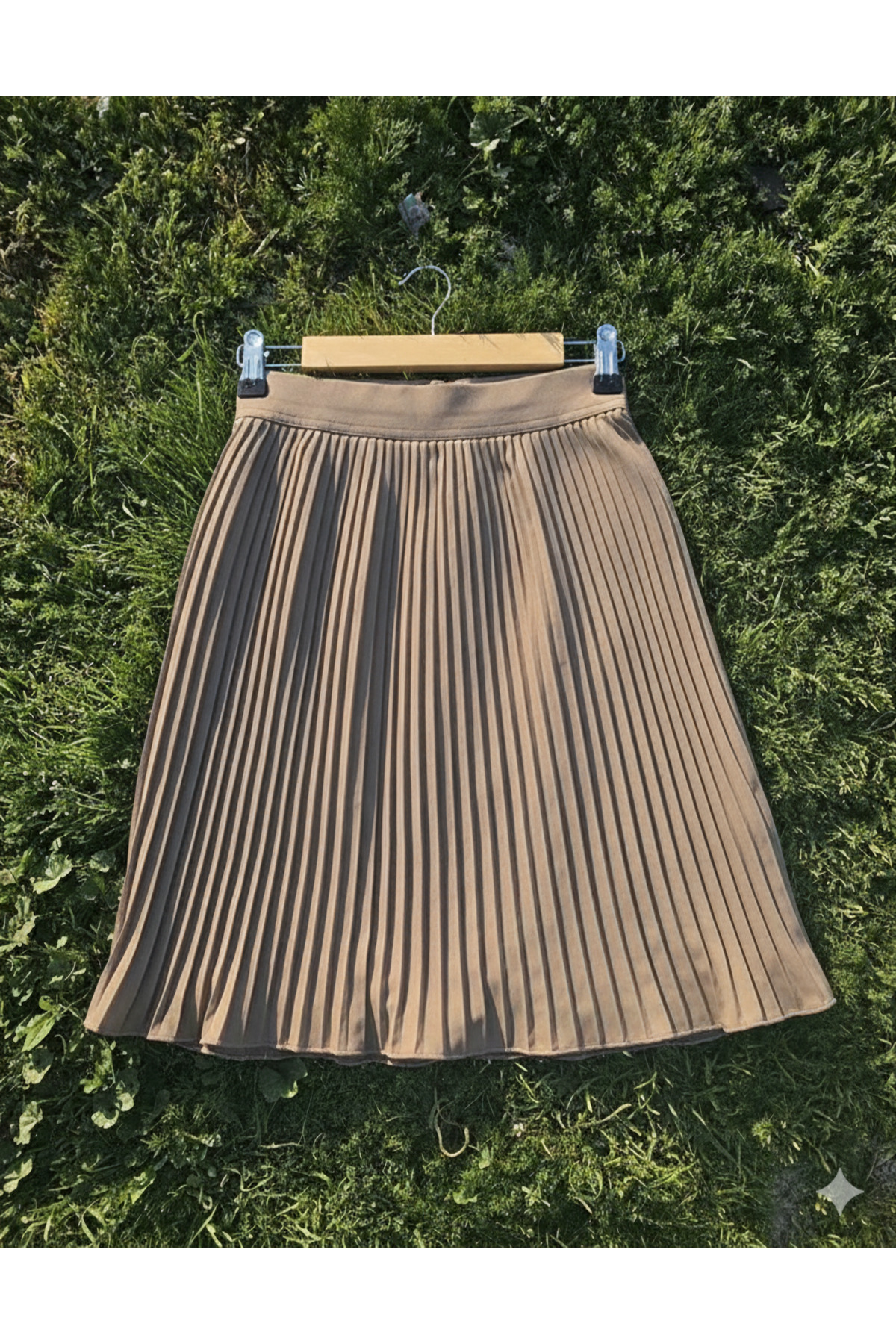 - Rahatlık ve şıklığı bir arada sunan ekru renkli piliseli mini etek, günlük kullanım için idealdir.