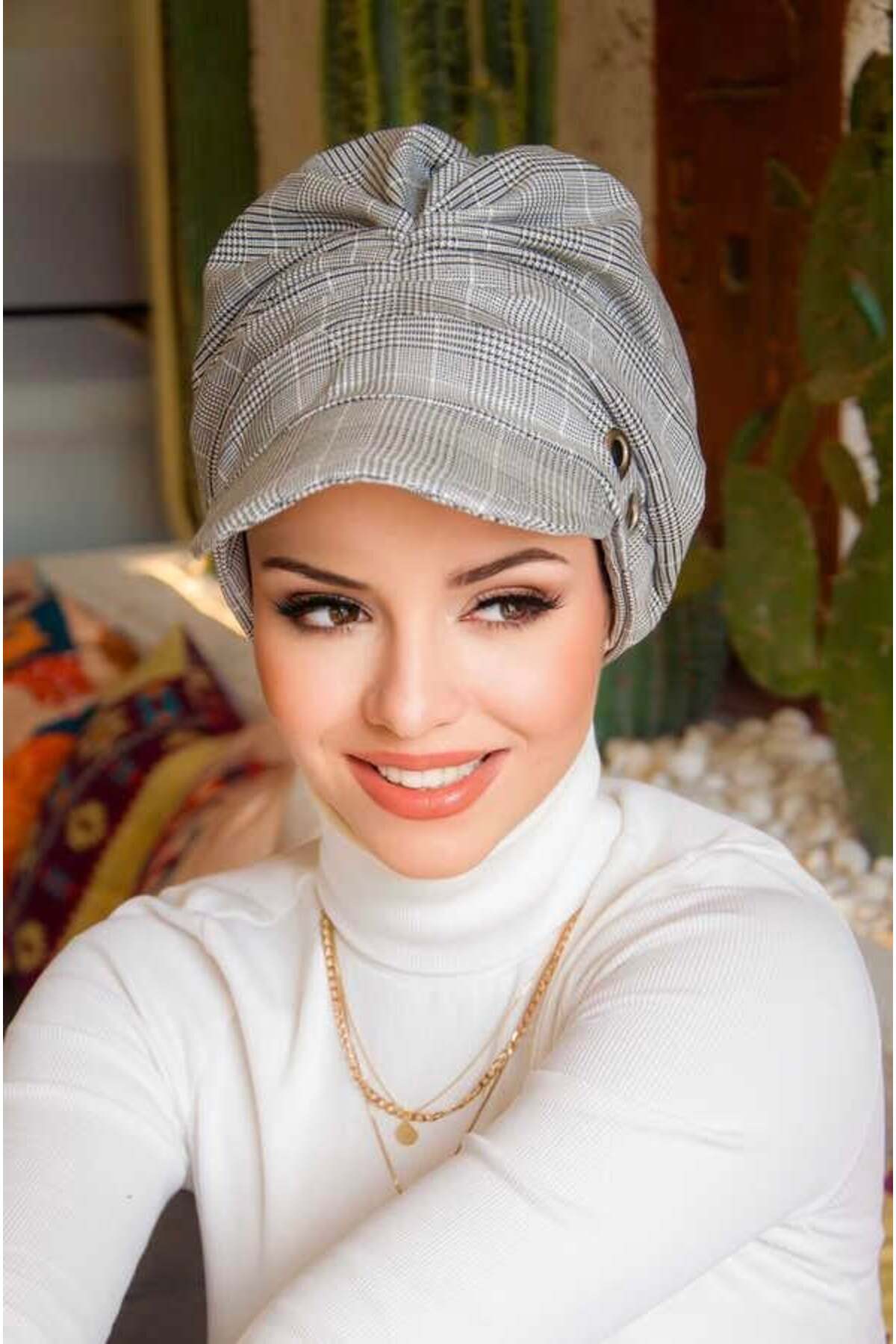 Gri Ekose Desen Metal Detaylı Tesettür Şapka Bone